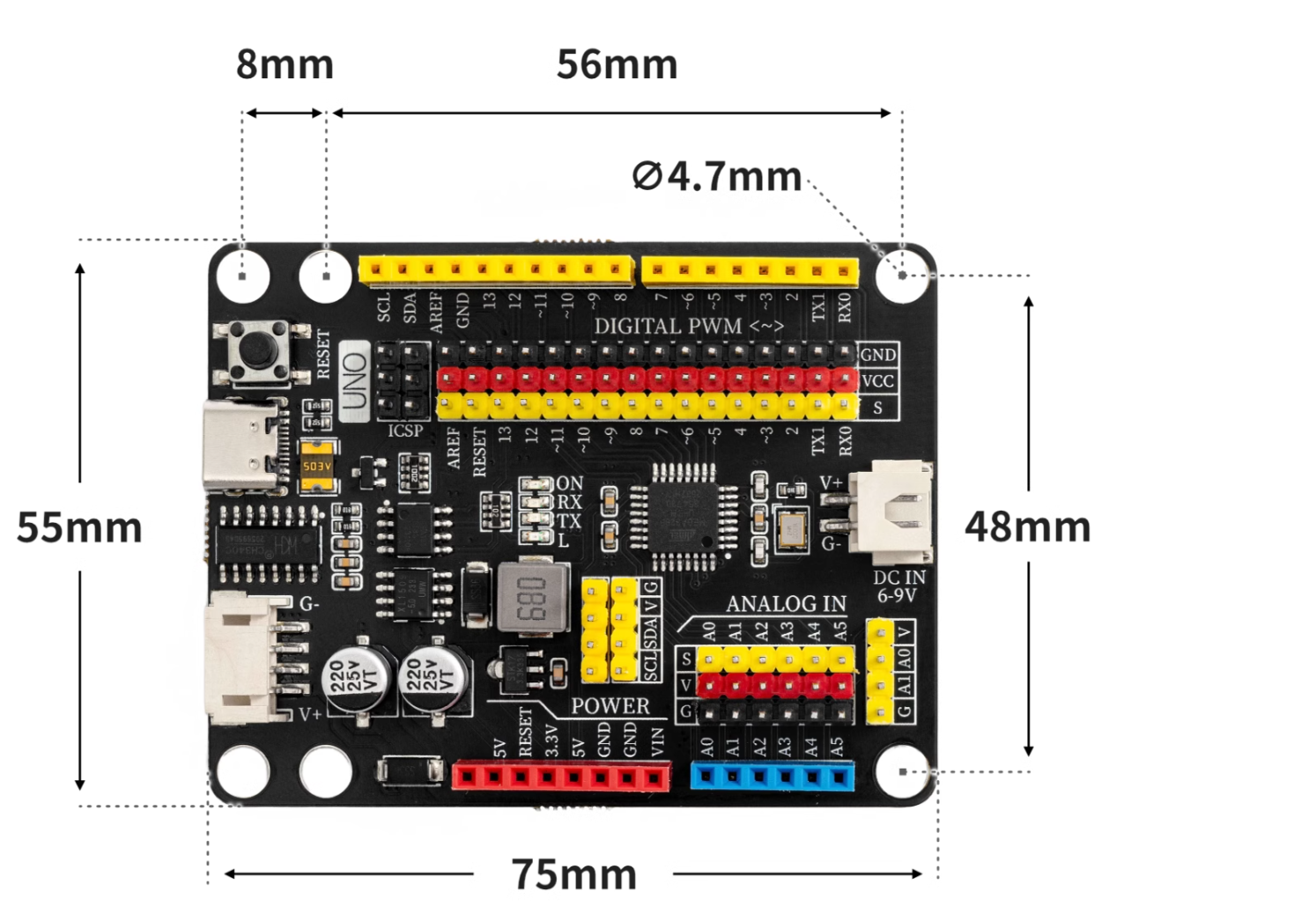 6、板载2.54间距G|V|S扩展排针接口,免扩展板使用