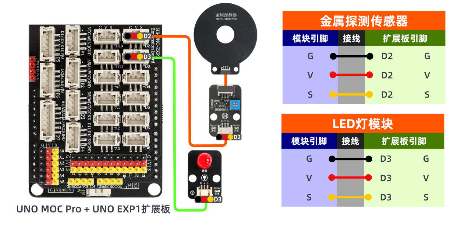 器件连接好线之后,将上述程序烧录到UNO-R3 PRO开发板之后,接通电源。放一个金属到探测盘上,此时探测到金属LED灯模块亮起,否则会熄灭。