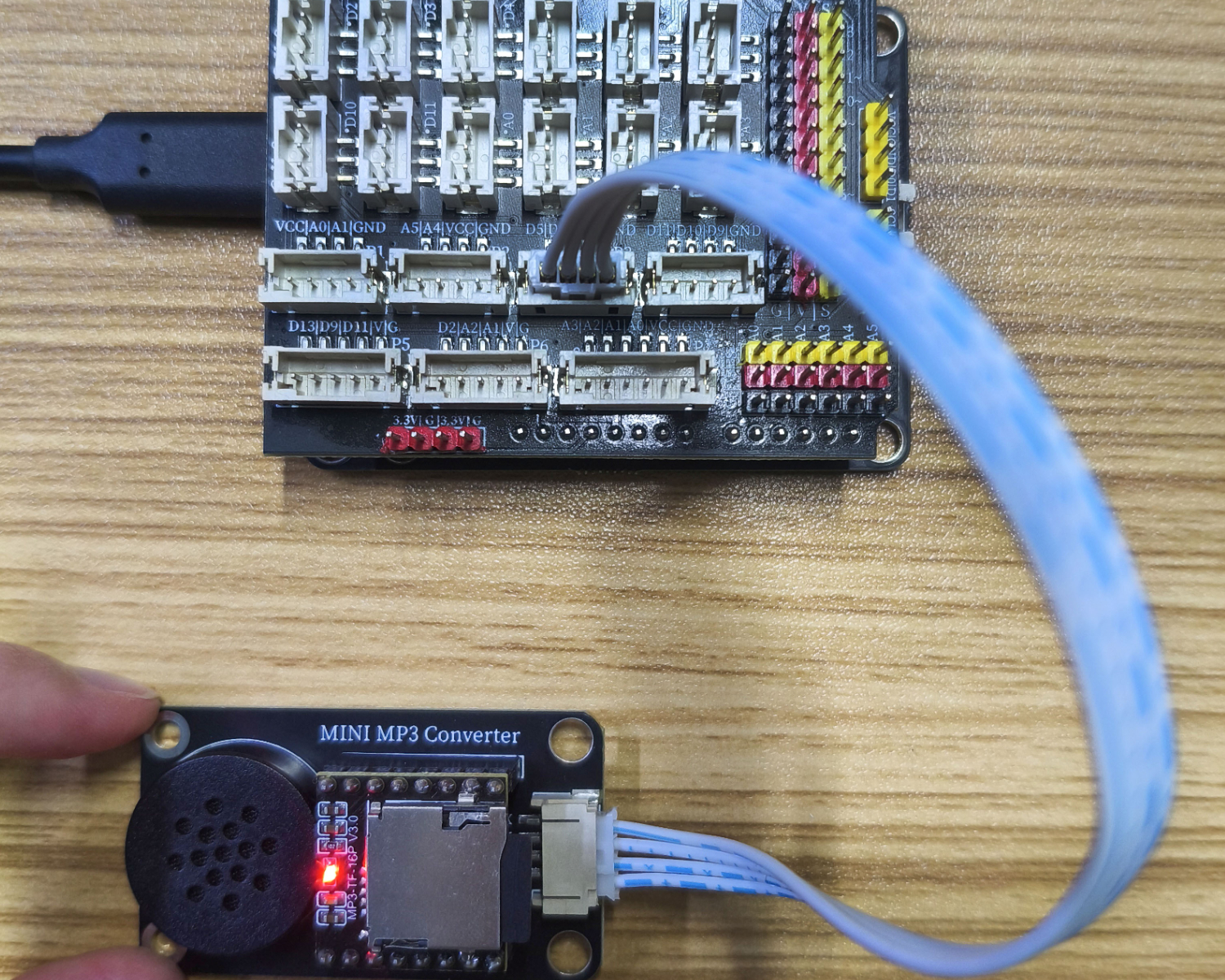 使用Mini MP3模块播放存储卡里的MP3歌曲,需要单独添加喇叭和Mini MP3模块连接,Mini MP3模块再通过杜邦线和Arduino等主控板连接,才可实现MP3播放功能。而我们这款产品已集成了喇叭,并且配有两排8P单排母座,可直接将Mini MP3模块插入(存储卡槽口方向和4P端子口方向一致,),并兼容乐高积木,通过4P端子转杜邦线和Arduino等主控板连接,进行程序设计,即可实现简单的MP3播放功能。