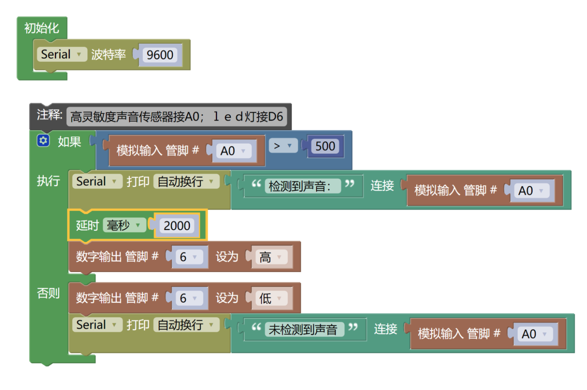 //高灵敏度声音传感器接A0;LED灯接D6
