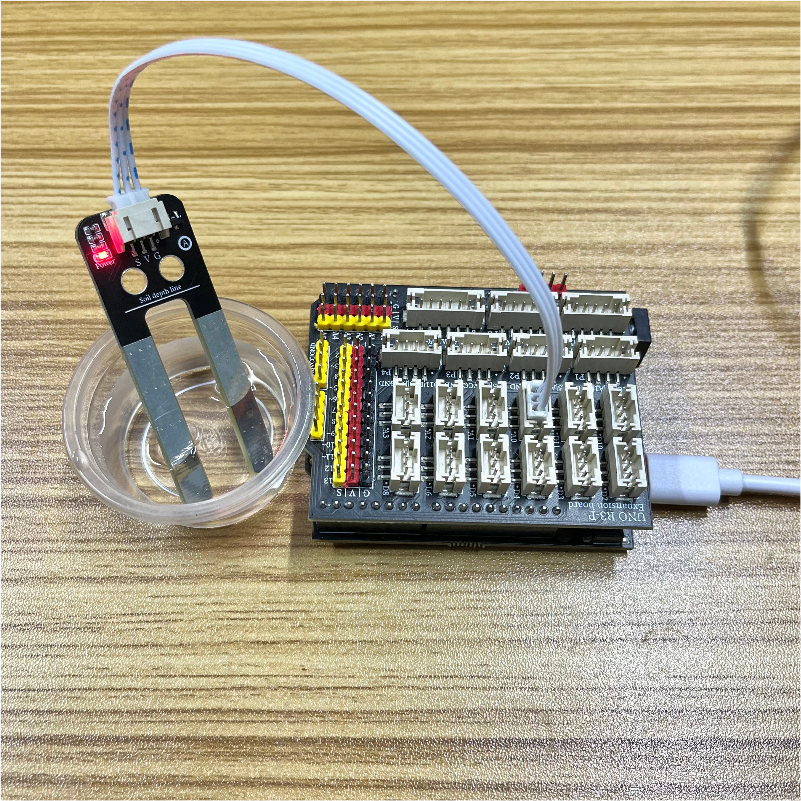 器件连接好线之后,将上述程序上传到Arduino UNO 开发板之后, 打开Mxily串口监视器,将土壤湿度传感器模块两个铜条插入土壤里或者水中,串口输出土壤的湿度值。