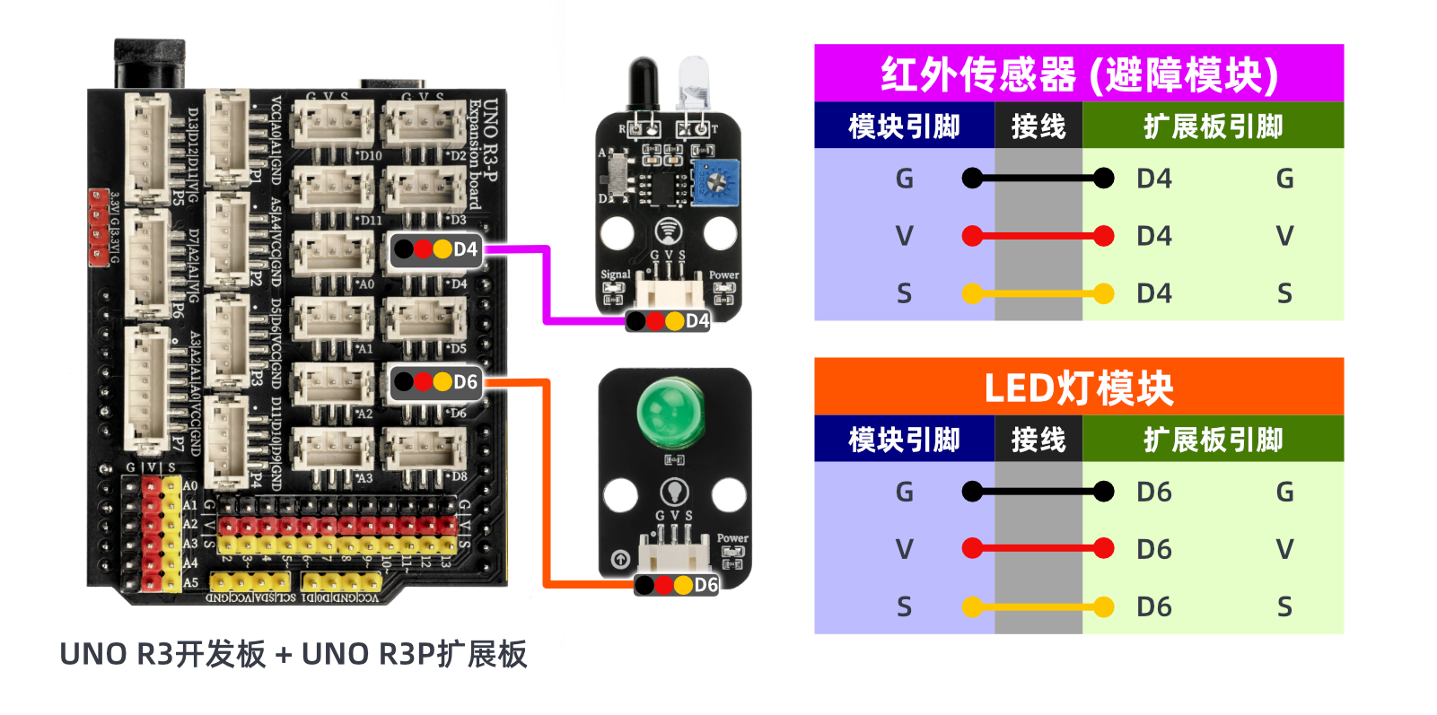 //红外避障模块s引脚接uno开发板D4引脚,A引脚空置;led灯接D6引脚;
