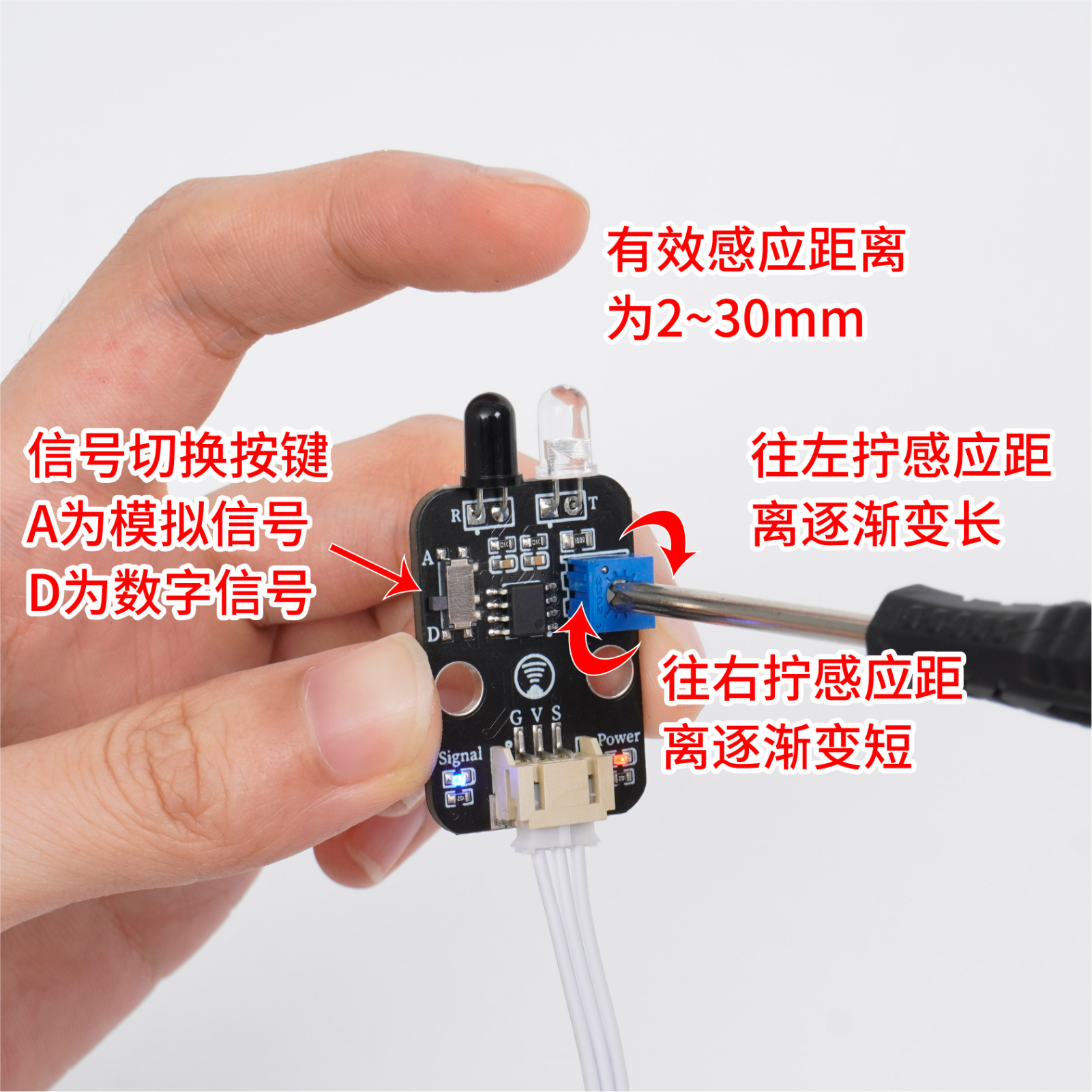 模块调试:在红外避障模块通电的情况下,用小螺丝刀调节红外避障模块的电位器,使手指离红外避障探头20mm左右,传感器信号指示蓝灯亮,手指离探头20mm外红外避障模块信号指示蓝灯熄灭。注意:红外避障模块的红外发射和接收探头对受环境光干扰较大,请不要在阳光太强的环境下调试。