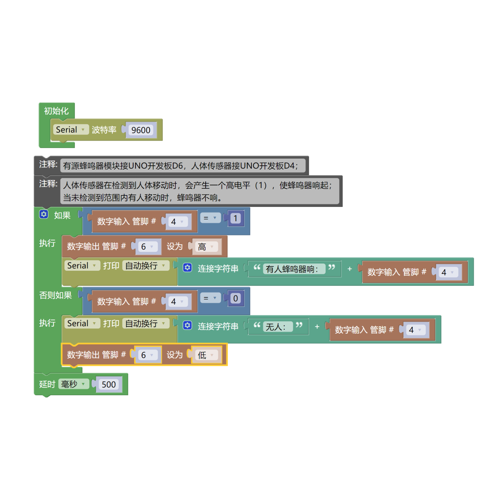 Arduino UNO测试结论:人体传感器在检测到人体移动时,会产生一个高电平(1),使蜂鸣器响起;当未检测到范围内有人移动时,蜂鸣器不响。