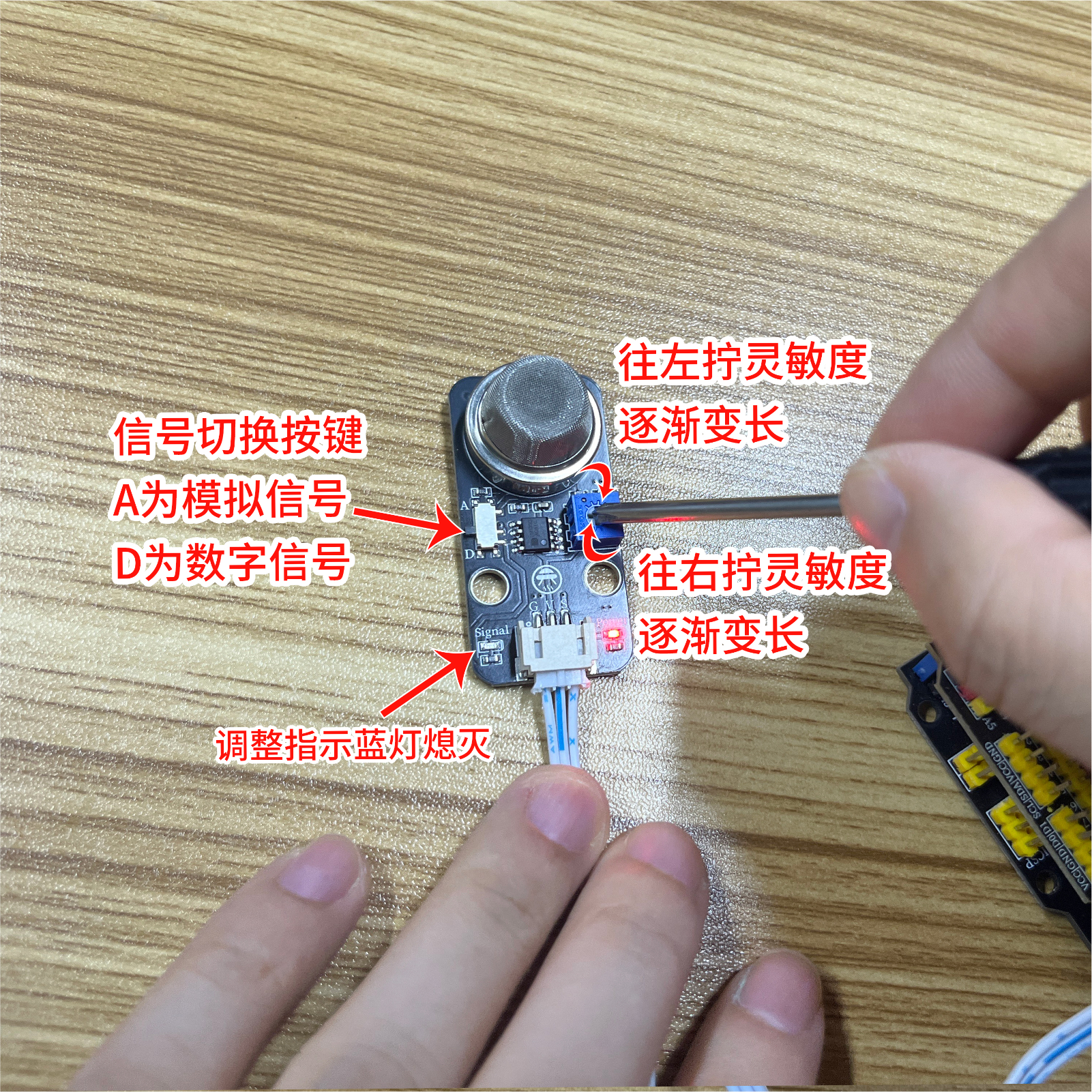 调节模块背面电位器的阈值,在气体传感器模块通电的情况下,用小螺丝刀调节传感器模块的电位器,调至在没有气体或者烟雾干扰的情况下,传感器信号指示蓝灯熄灭,有气体或者烟雾情况下气体传感器模块信号指示蓝灯亮起。
