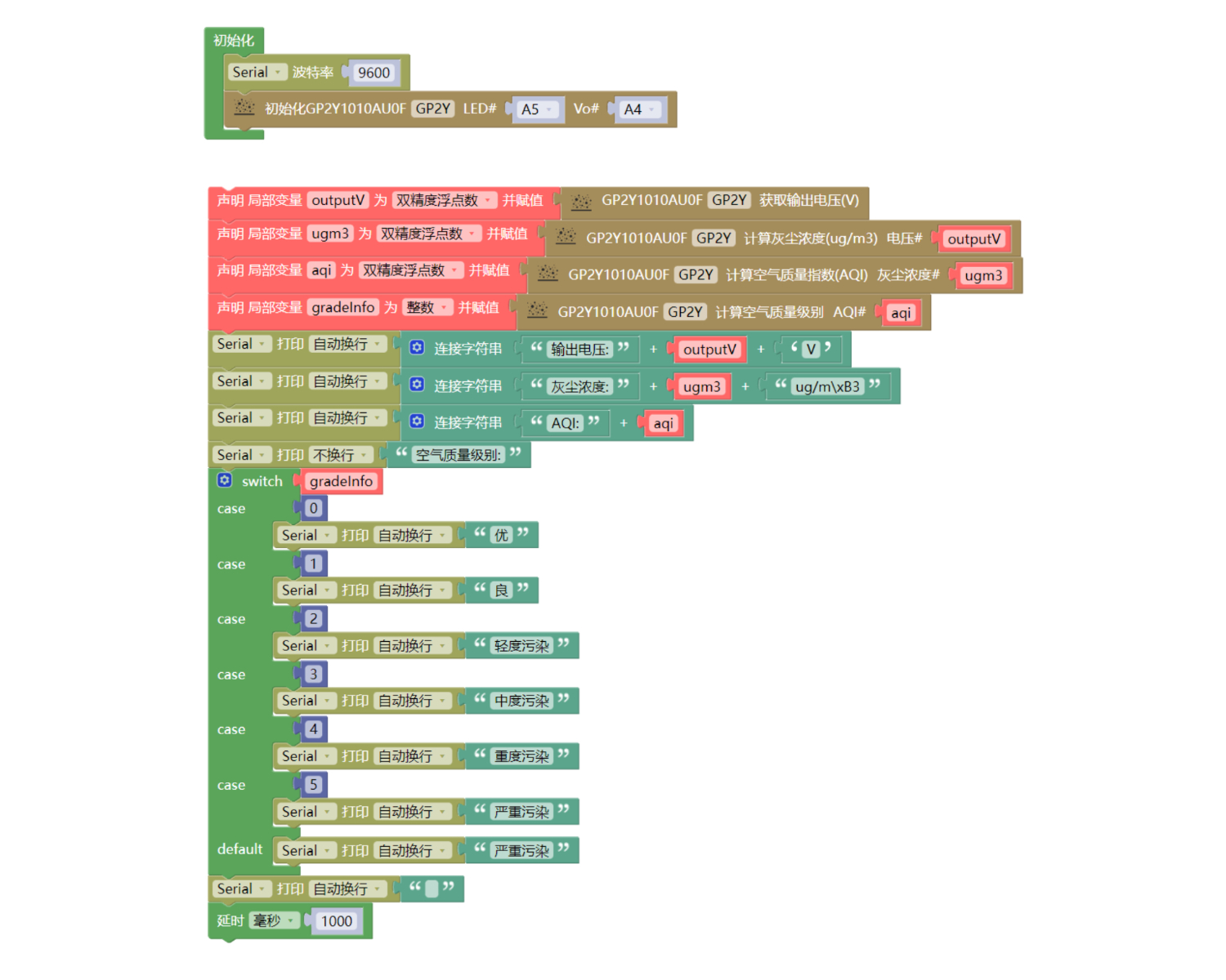 下入代码,之后电脑串口显示需要的信息,如灰尘浓度,空气质量等等。