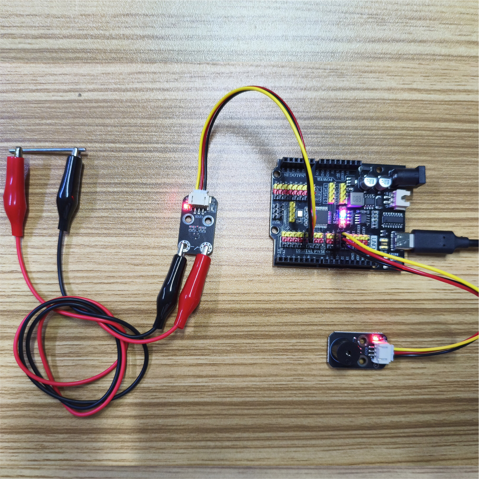 将器件连接好线之后,上传程序到Arduino UNO 开发板之后,将会发现当电导开关模块连接到导体时,蜂鸣器会随之响起;反之,蜂鸣器不响。