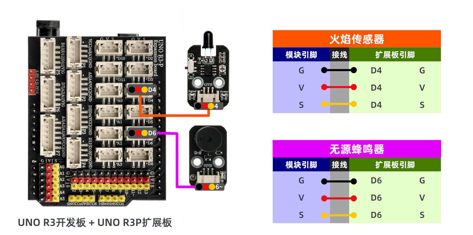 //火焰传感器s引脚接D4,火焰传感器A接A0(如需要检测火焰传感器模拟值);无源蜂鸣器接D6口;
