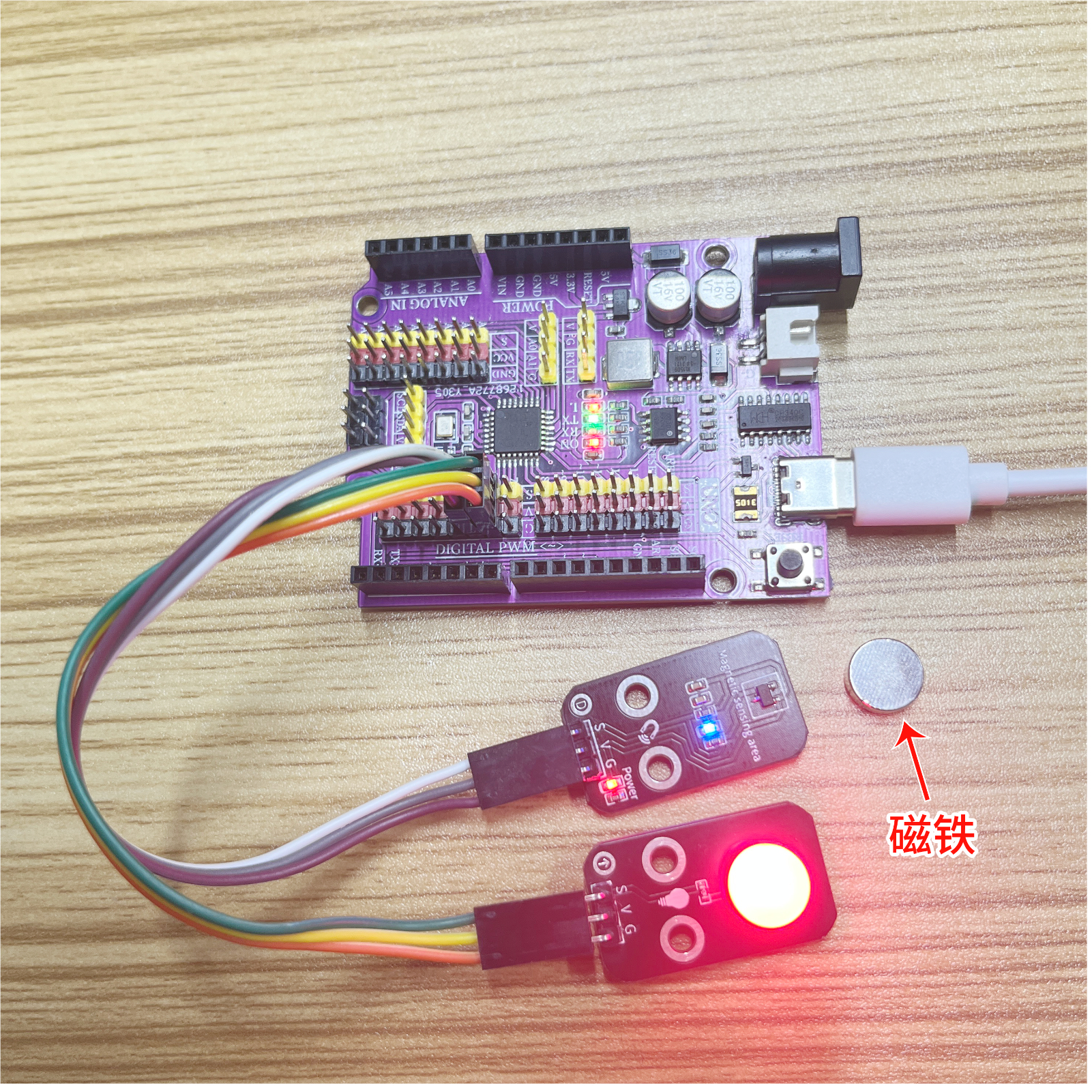 器件连接好线之后,将上述程序上传到 Arduino UNO 开发板后,打开串口监视器。当没有磁场靠近全极霍尔传感器开关的时候LED熄灭,串口输出“关灯状态:1”;当有磁铁等具有磁场的物体靠近全极霍尔传感器开关时,LED灯点亮,串口输出“开灯状态:0”。