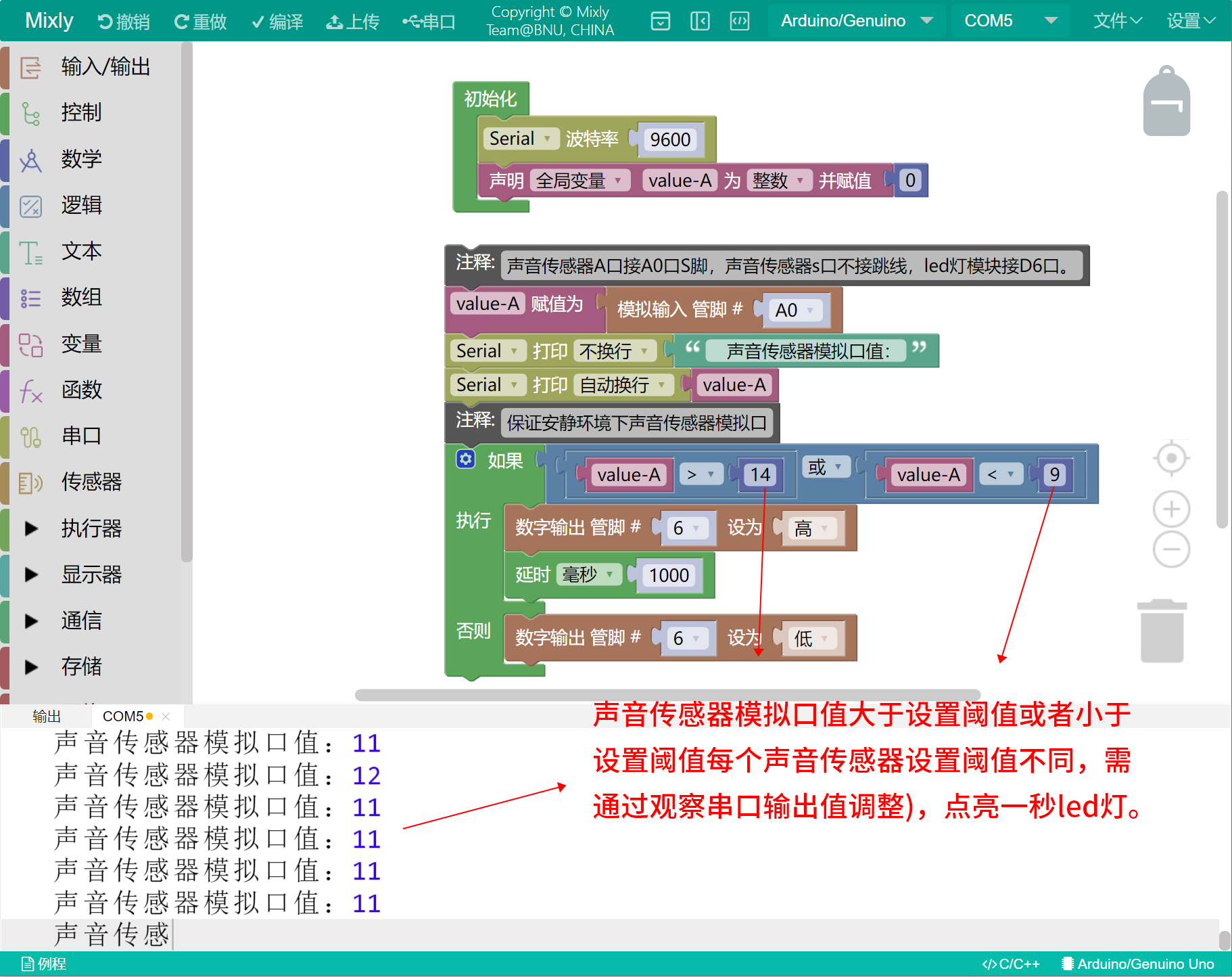 value_A = analogRead(A0);//声音传感器A口接A0口S脚,声音传感器s口不接跳线,led灯模块接D6 口。