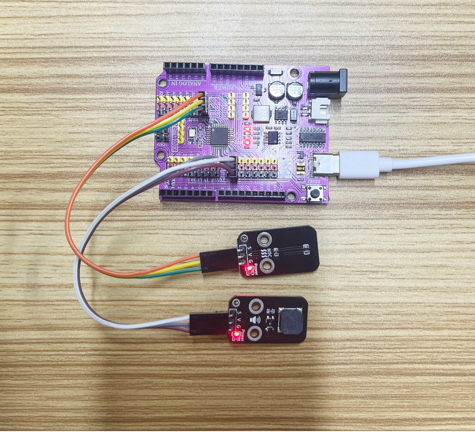 Nachdem die Kabel an den Bauteil angeschlossen sind, kopieren Sie das obige Programm auf die Arduino-UNO-Entwicklungsplatine, öffnen Sie den seriellen Monitor, stellen Sie die Baudrate auf 9600 ein. Wenn die umgebende Temperatur auf einen bestimmten Wert steigt, ertönt der passive Heulton, zu diesem Zeitpunkt können Sie den Wert im seriellen Monitor überprüfen. Sie werden feststellen, dass der analoge Wert niedriger ist, wenn die umgebende Temperatur niedriger ist als bei höherer Temperatur.