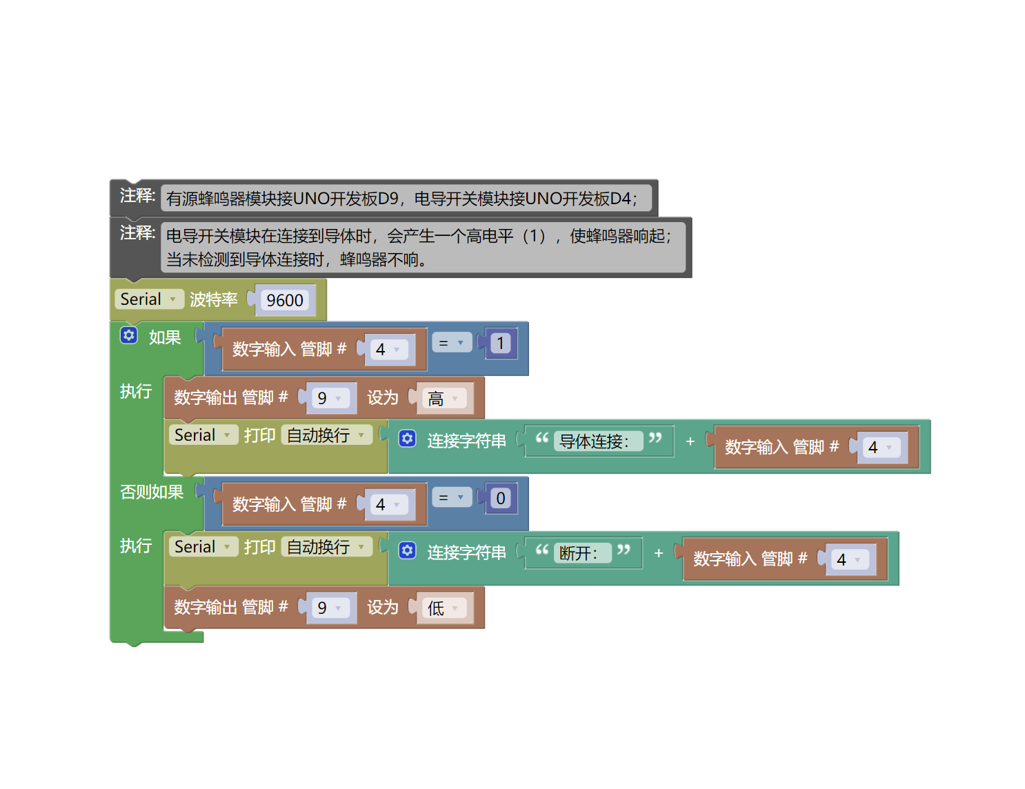 //电导开关模块在连接到导体时,会产生一个高电平(1),使蜂鸣器响起;