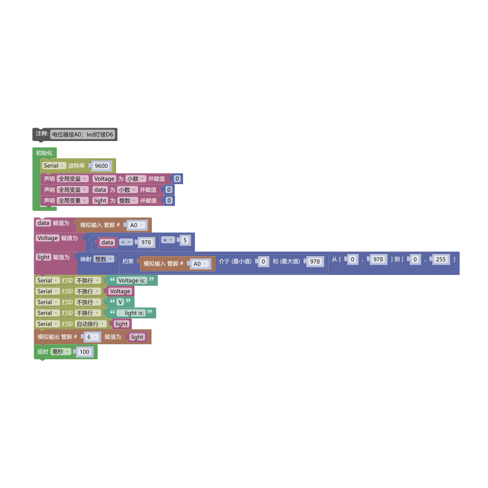 light = (map(constrain(analogRead(A0), 0, 978), 0, 978, 0, 255));//将电位器电压模拟值缩放至light变量以符合模拟输出取值范围,正常模拟输出PWM波取值为0-255