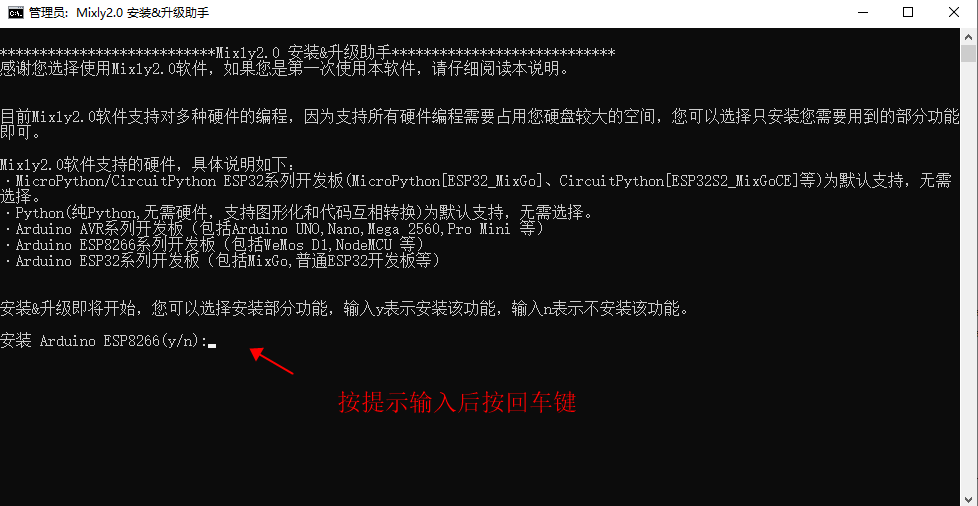 Weil unsere Platinen die ESP32-Serie sind, geben Sie wie angezeigt 'y' ein und drücken Sie die Eingabetaste (Return-Taste), um automatisch zu installieren. Nach der Installation drücken Sie eine beliebige Taste auf der Tastatur, um abzubrechen.