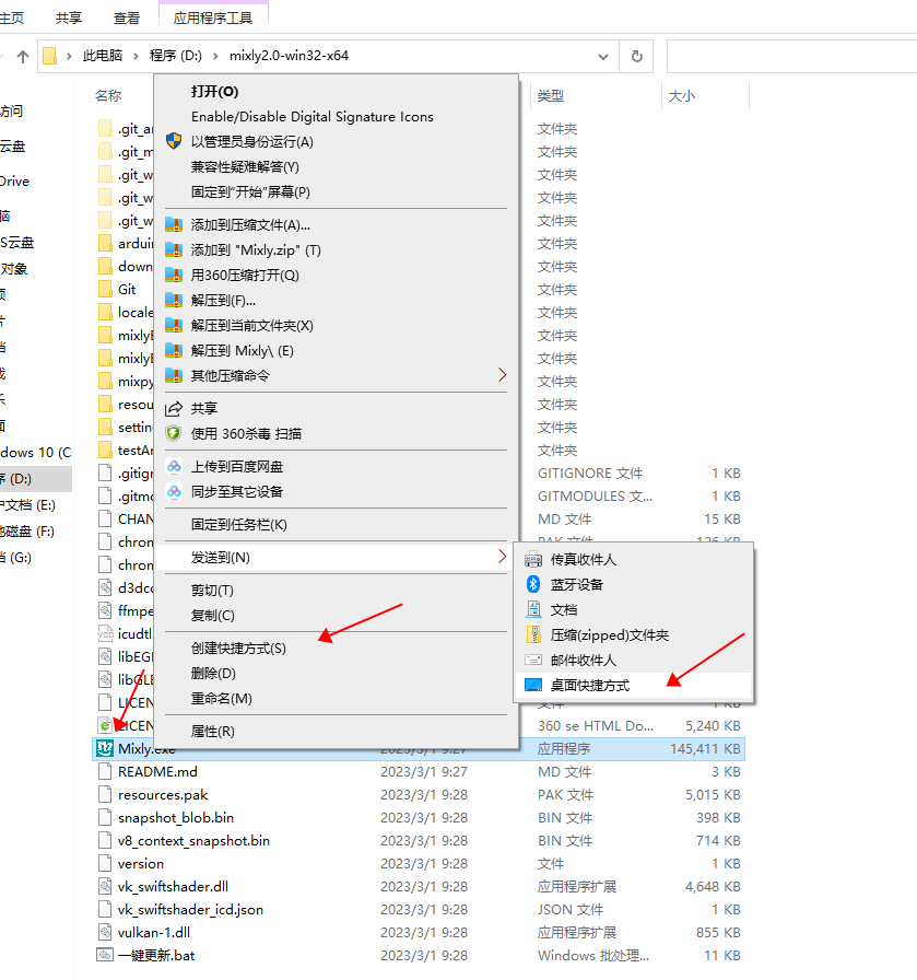 Mit der rechten Maustaste auf Mixly.exe klicken und auf den Desktop senden, um ihn für zukünftige Verwendung zur Verfügung zu haben.