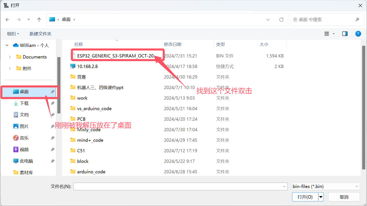 In der Datei öffnen Sie das Symbol für die Auswahl, wählen Sie den soeben heruntergeladenen Micropython-Firmware aus