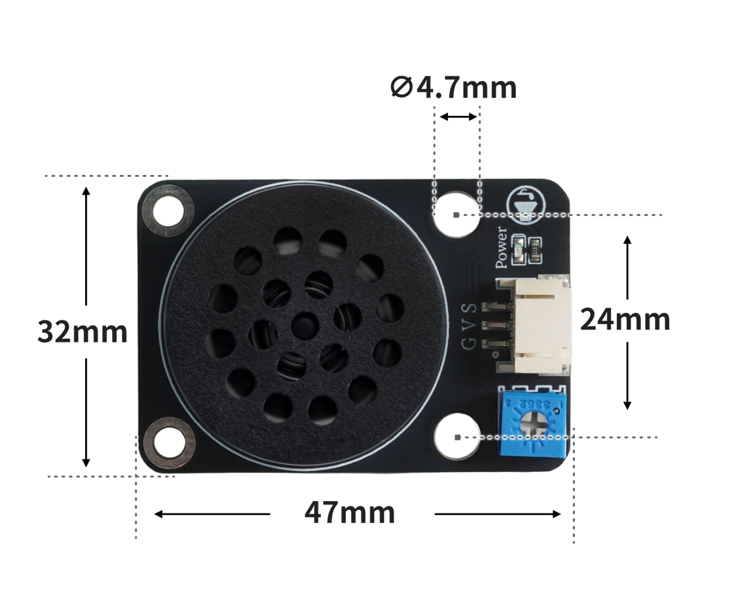Der verstärkte Audiosignal treibt den Lautsprecher an, der den elektrischen Signal in ein akustisches Signal umwandelt und so den Ton erzeugt.Durch Einstellen des blauen Drehknopfes können bestimmte Parameter des Verstärkers (wie die Verstärkung usw.) geändert werden, um die Lautstärke der Ausgangssounds anzupassen.Durch Einstellen verschiedener Frequenzen (Töne) kann in der Regel eine einfache Musikmelodie abgespielt werden, die zur Herstellung einfacher elektronischer Musikinstrumente wie eines E-Pianos, einer Musikbox und ähnlichem verwendet wird.Man kann ihn als passiven Buzzer verwenden, die Potentiometer auf dem Modul kann mit einem Schraubenzieher manuell eingestellt werden.
