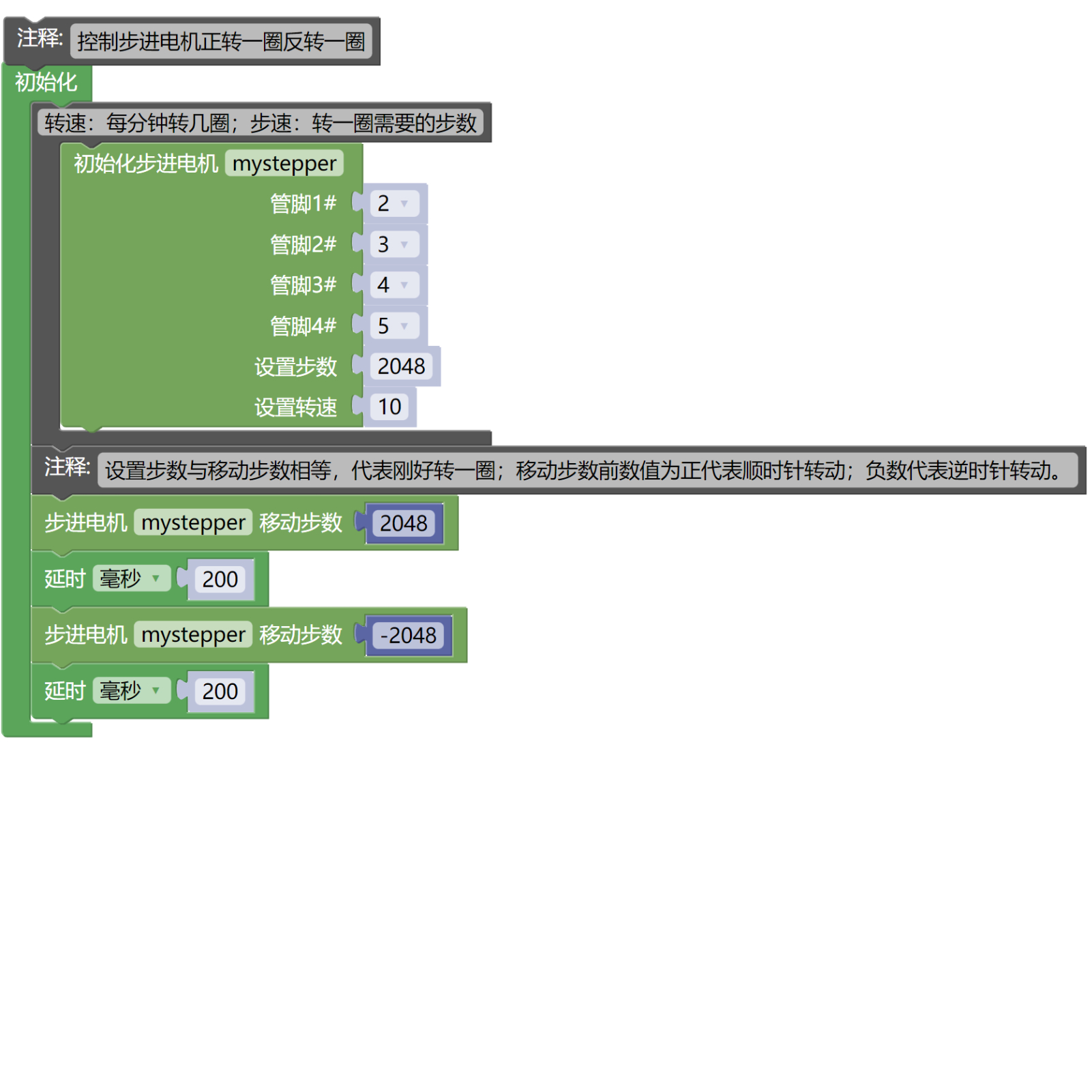 //设置步数与移动步数相等,代表刚好转一圈;移动步数前数值为正代表顺时针转动;负数代表逆时针转动。