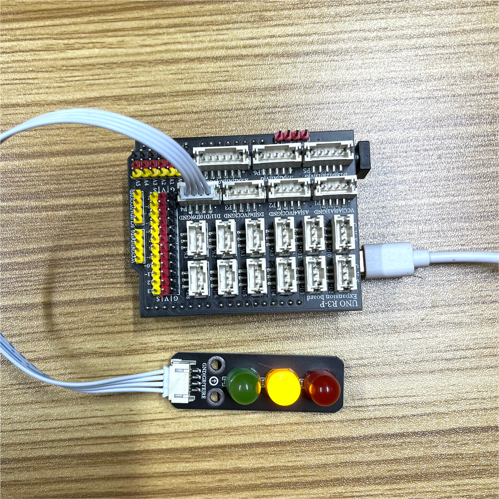 LED ist die Abkürzung für Leuchtdiode, die aus einer Mischkombination besteht, d.h. Gallium (Ga), Arsen (AS), Phosphor (P).Phosphor-dot GaAs-Lichtdioden emittieren rotes Licht, Phosphor-dot GaAs-Lichtdioden emittieren grünes Licht, Siliziumcarbid-Lichtdioden emittieren gelbes Licht.Der Sperrspannungswert der Leuchtdioden beträgt 5V.Sein Positiv-Verlustwiderstandskennlinie ist zu steil, daher ist auf dem Modul eine Begrenzungswiderstand installiert, um den Strom zu kontrollieren, der durch den Rohrleitung verwendet wird.Die Ampel ist eine Platine mit 3 verschiedenenfarbigen LED-Leuchten, deren An und Aus durch das Steuern der entsprechenden Pins gesteuert wird.