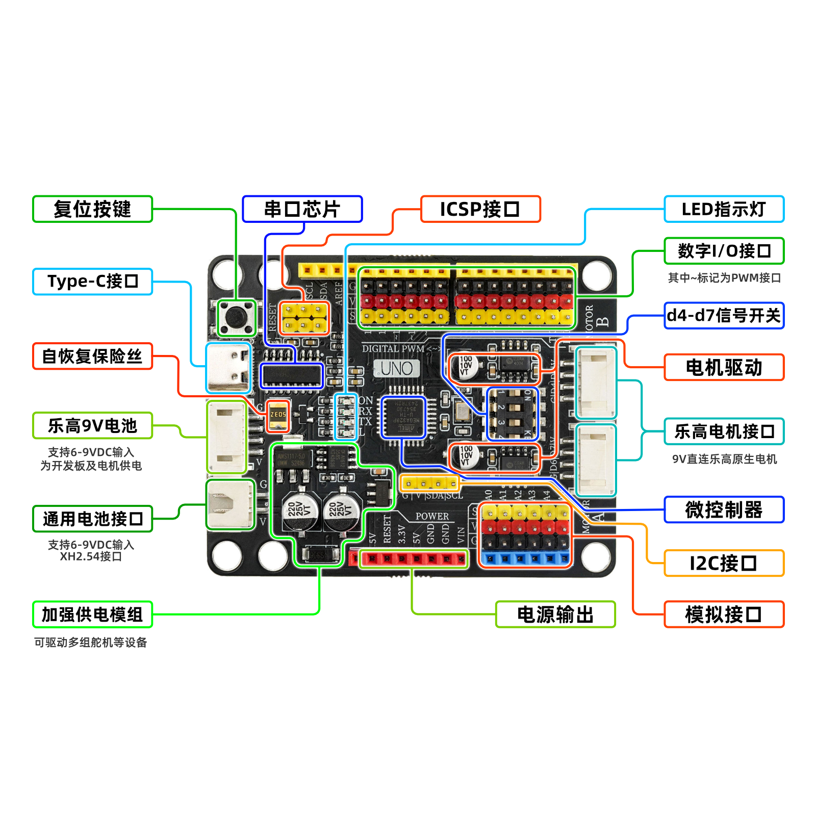 The built-in simulation G|V|S expansion interface connects to the simulation sensor more conveniently and quickly, adding A6, A7 simulation input interfaces, and can connect more sensors.⑪ICSP serial data interface