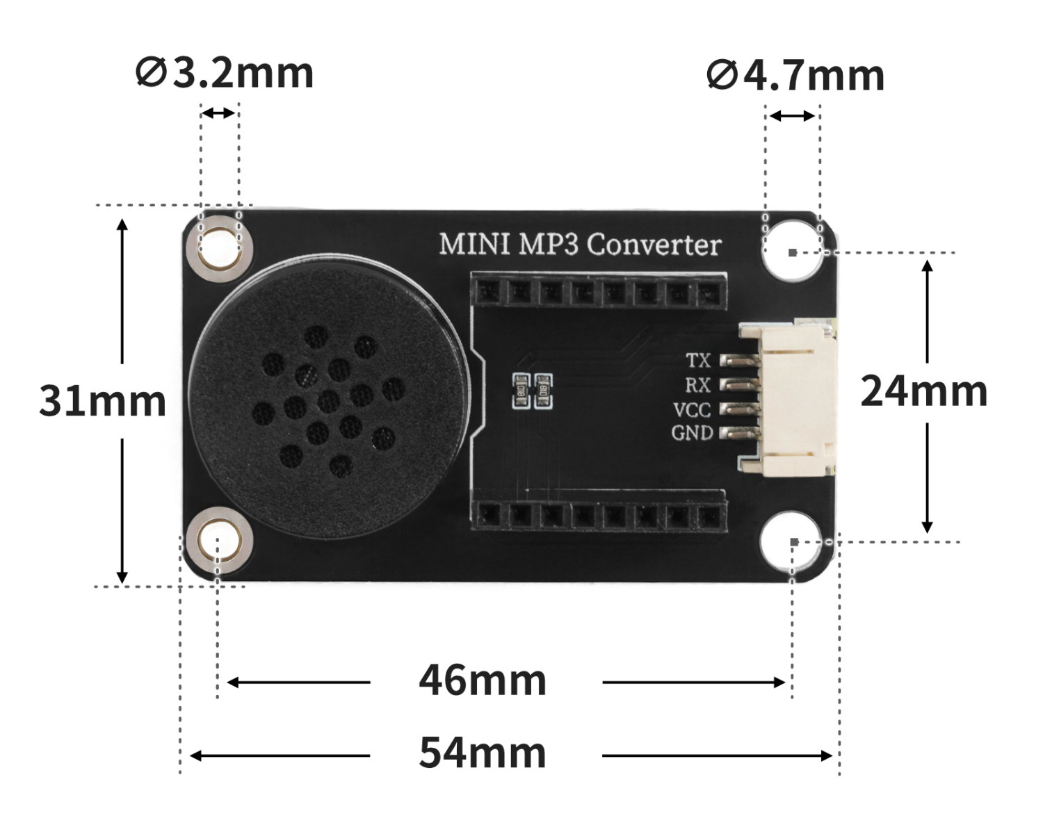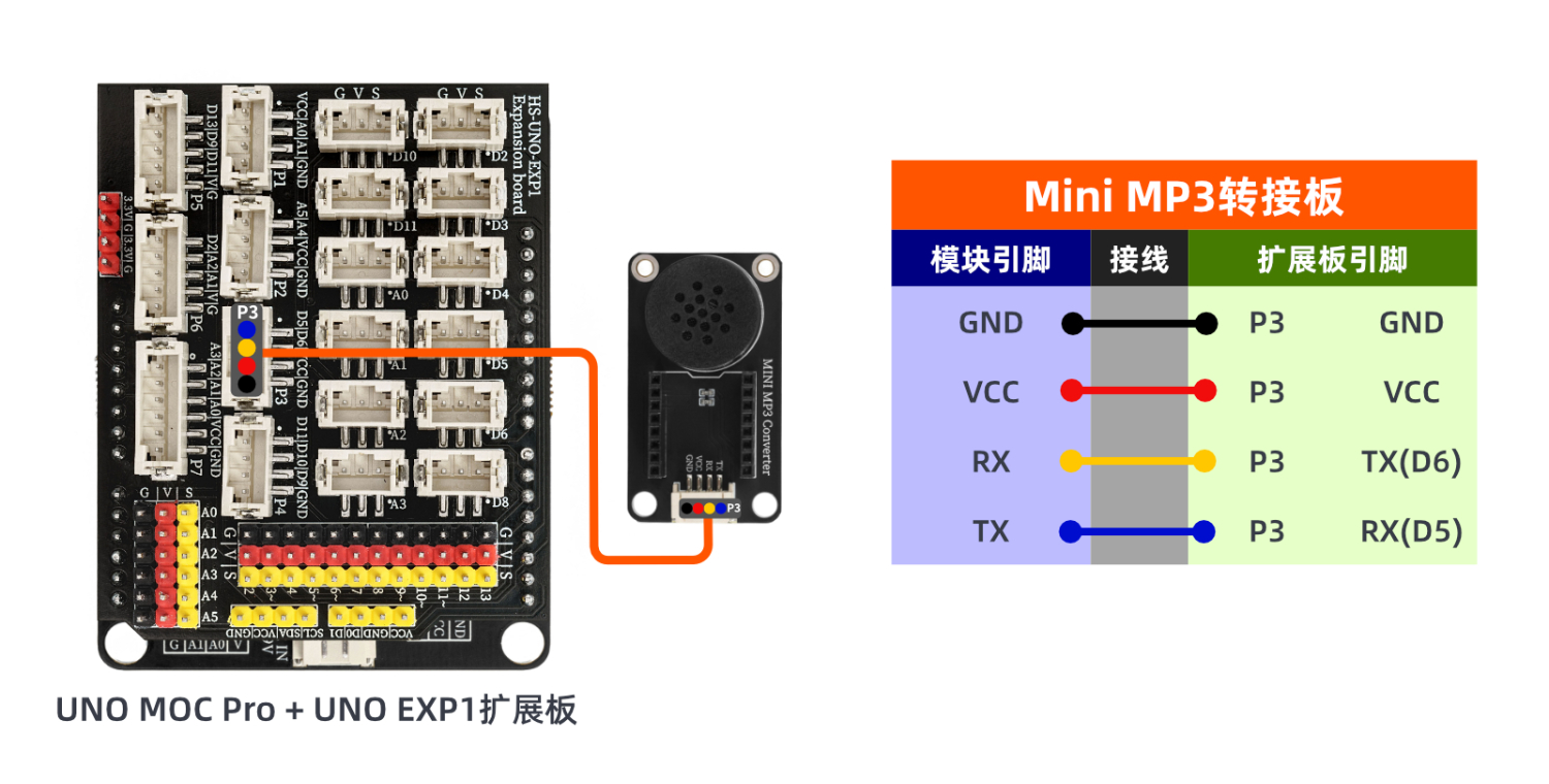 Use the Mini MP3 module to play MP3 songs from a storage card, it is necessary to add a speaker and connect the Mini MP3 module separately, and then connect the Mini MP3 module to the main control board such as Arduino via DuPont wires to achieve the MP3 playback function.Our product has integrated a speaker and is equipped with two rows of 8P single-row female sockets, which can directly insert the Mini MP3 module (the direction of the storage card slot and the 4P terminal port are the same), and is compatible with LEGO bricks. It can be connected to the main control board such as Arduino through the 4P terminal to DuPont wires for program design, thereby realizing simple MP3 playback function.