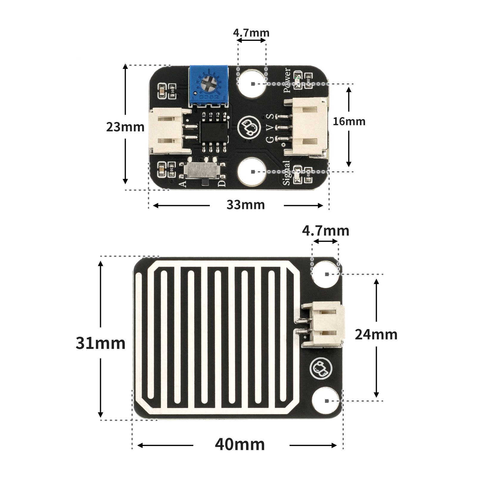 A raindrop sensor is a sensing device mainly used to detect whether it is raining and the size of the rainfall, and is widely used in automatic windshield wiper systems, smart lighting systems, and smart skylight systems, etc.The sensor uses high-quality FR-04 double material, with a large area of 5.0 * 4.0 centimeters, and nickel-plated surface processing.It has antioxidant, conductive properties, and superior durability; sensitivity is adjusted with a potentiometer; operating voltage is from 3.3 V to 5 V.Output in the form of digital values (0 and 1) and analog AO voltage output, using an LM393 dual voltage comparator, when the sensor is connected to a 5V power supply and there are no droplets on the sensing board, the DO output is at a high level.When the droplet falls, the DO output is low level.If we wipe away the droplets, the output will return a high-level state.AO analog output can be connected to the microcontroller's AD interface to detect the size of the raindrop above.DO digital output can also be connected to a microcontroller to detect if it is raining.