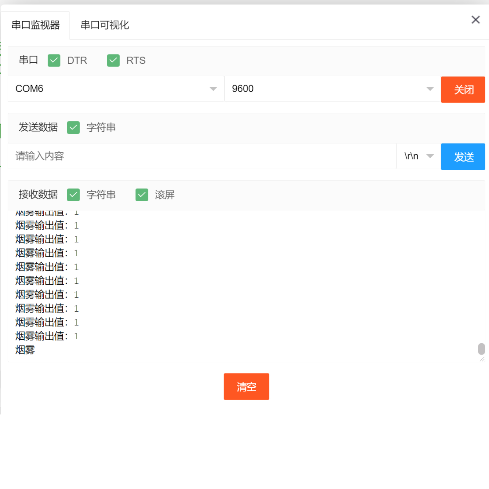 //打开串口监视器,查看串口烟雾传感器输出值,调节电位器,没有烟雾或者气体,模块指示灯熄灭。