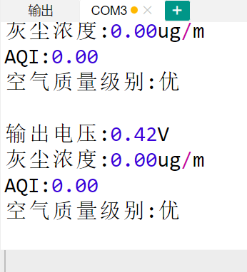 Enter the code, and then the computer serial port displays the required information, such as dust concentration, air quality, etc.