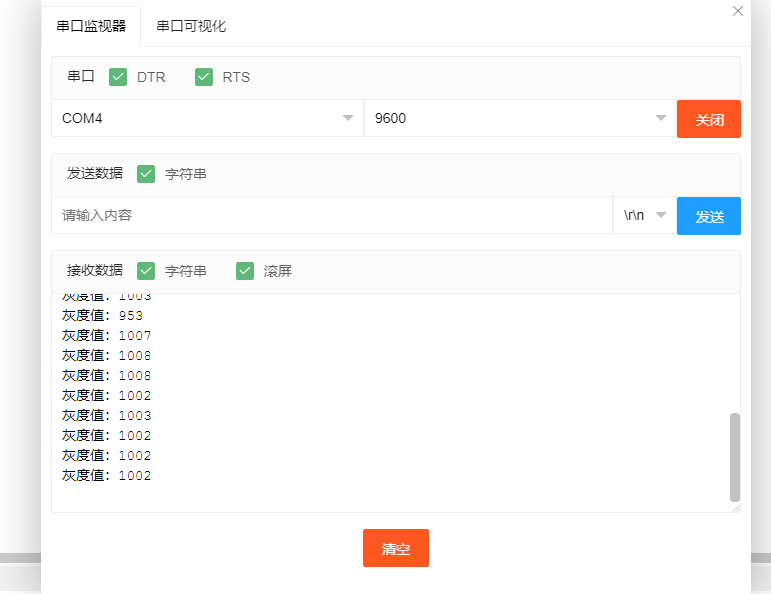 After connecting the device lines, upload the above program to the Arduino UNO development board, open the Mxily serial port monitor, place the sensor on paper with different gray levels, and we observe that the serial port prints out different measured analog value numbers.
