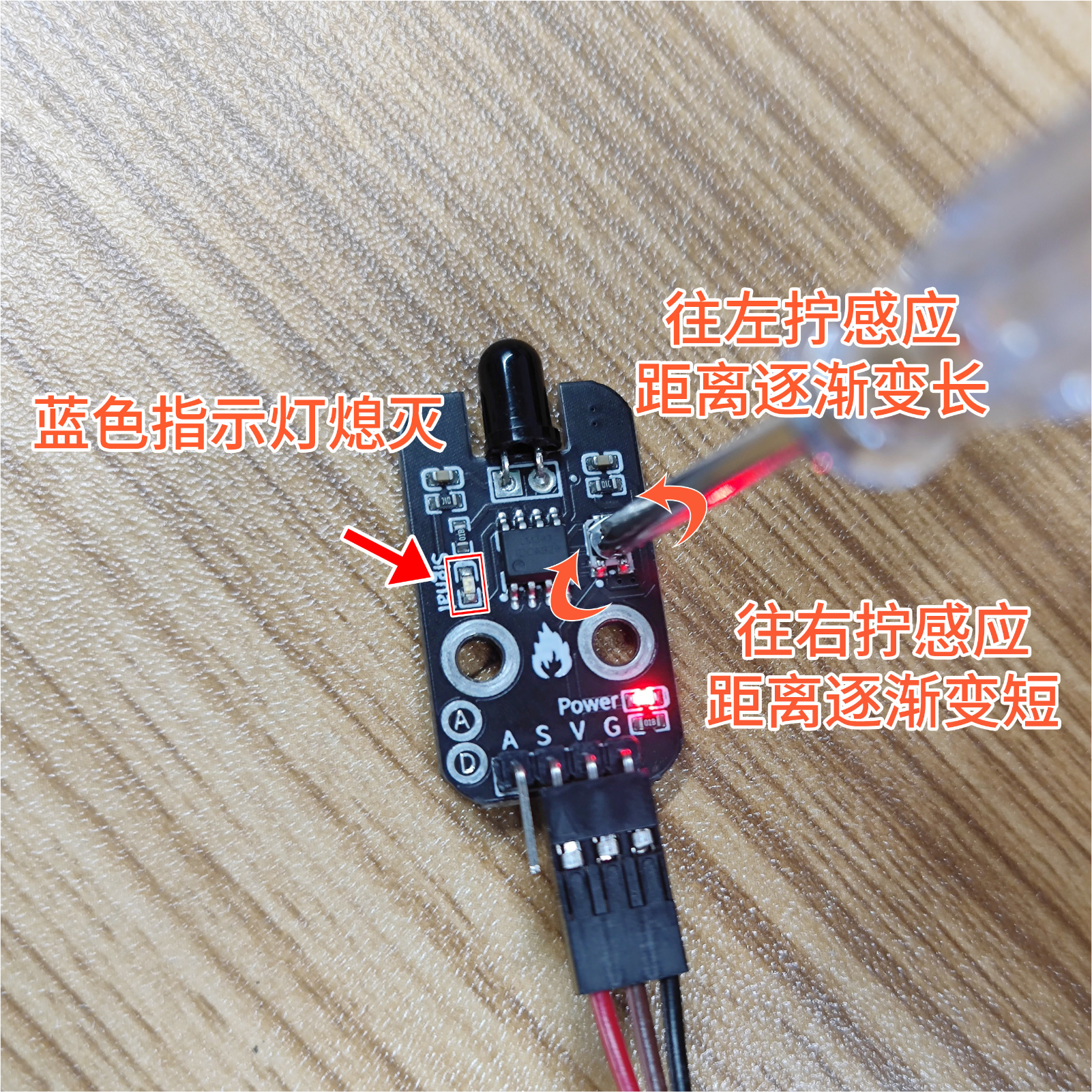 In the case of the flame sensor module being powered on, adjust the module potentiometer with a small screwdriver, when the flame is detected, the sensor signal indicates the blue light is on, and when there is no flame detected, the module signal indicates the blue light is off.