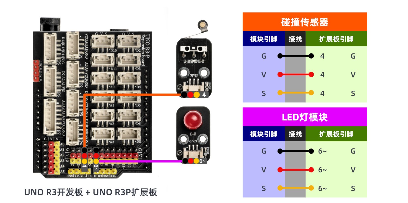 //碰撞开关接uno开发板D4引脚;LED灯模块接D6引脚