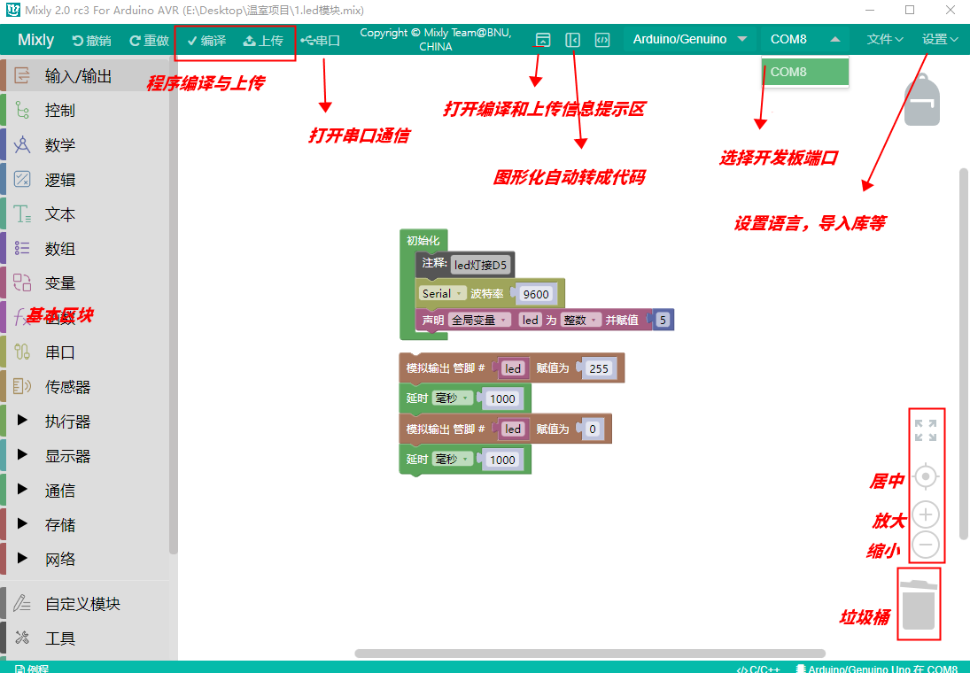 Before uploading the code program to the Arduino development board or compatible board, you must first understand the functions of each area and interface that appear in the Misaki software toolbar.