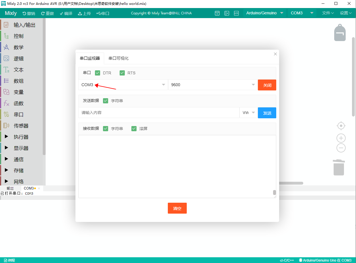 It should be noted that the serial port monitoring window should be closed when uploading the program. Otherwise, the program upload will fail.