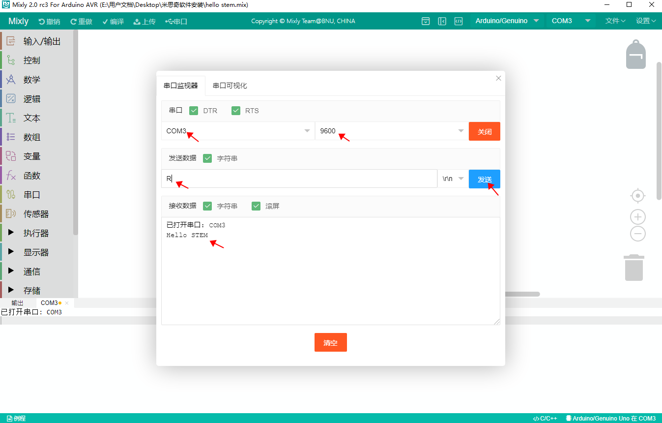 Then set the baud rate to 9600, enter 'R' and click send, you should see the board LED (D13) blink 5 times, and the serial port output displays Hello stem.