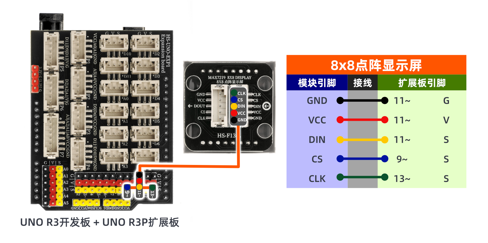 The 8*8 dot matrix module is driven by MAX7219, which is an integrated serial input/output display driver, only 3 IO ports are needed to drive 1 dot matrix, the dot matrix display has no flicker and supports cascading,The 8x8 dot matrix module is driven by Max7219, which uses three-wire serial communication. When receiving Arduino data, it stores the data in the internal 8x8 bit static RAM of the chip, and then controls the high and low levels of each pin of the 8x8 dot matrix module through Max7219 to achieve the display purpose.