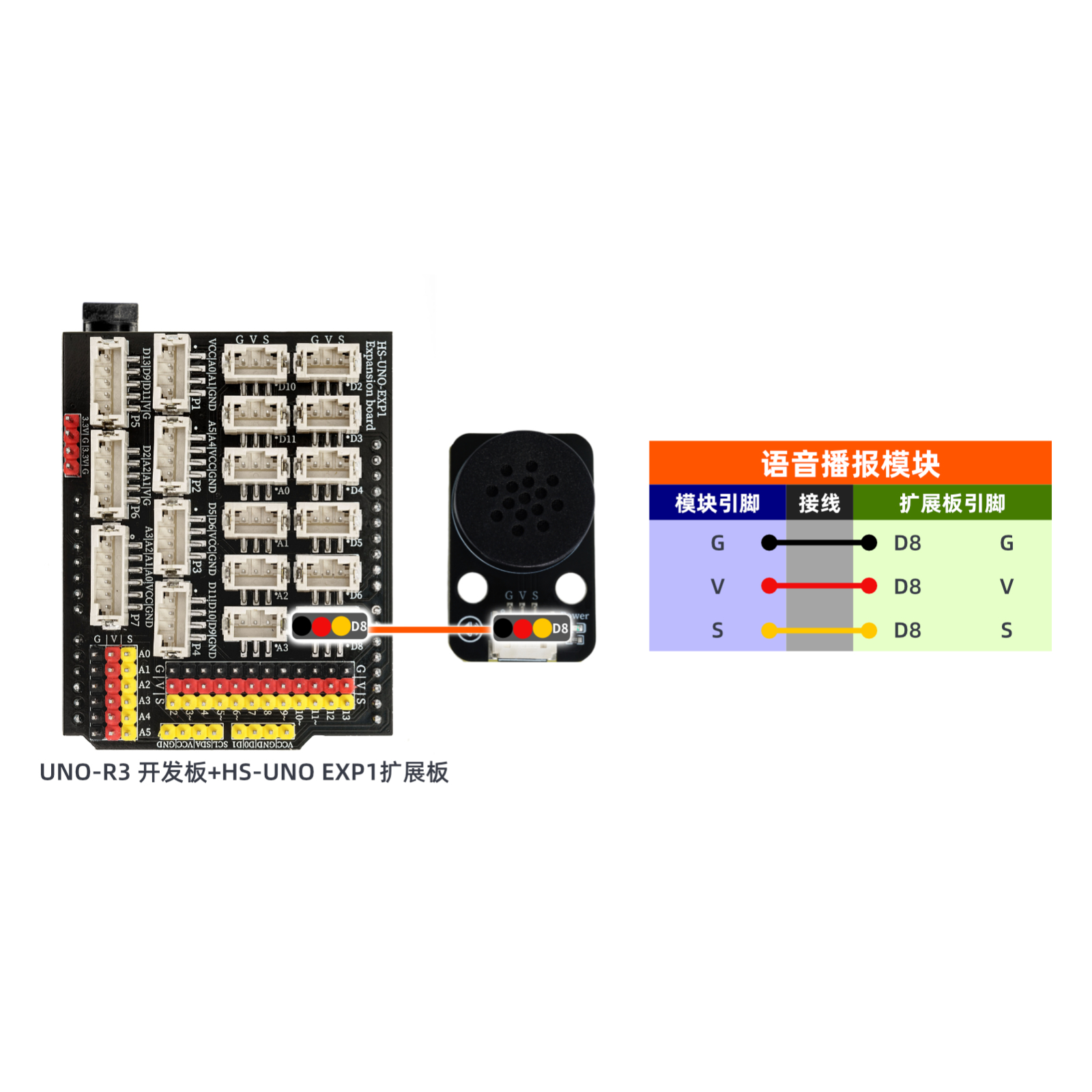 After connecting the device and uploading the program to the Arduino UNO development board, you will find that the voice broadcast module plays the statements set by the program in a loop.