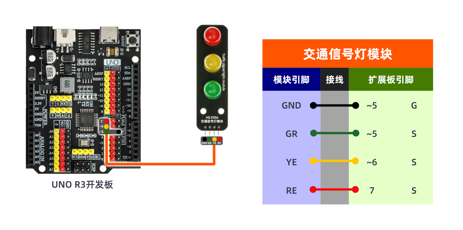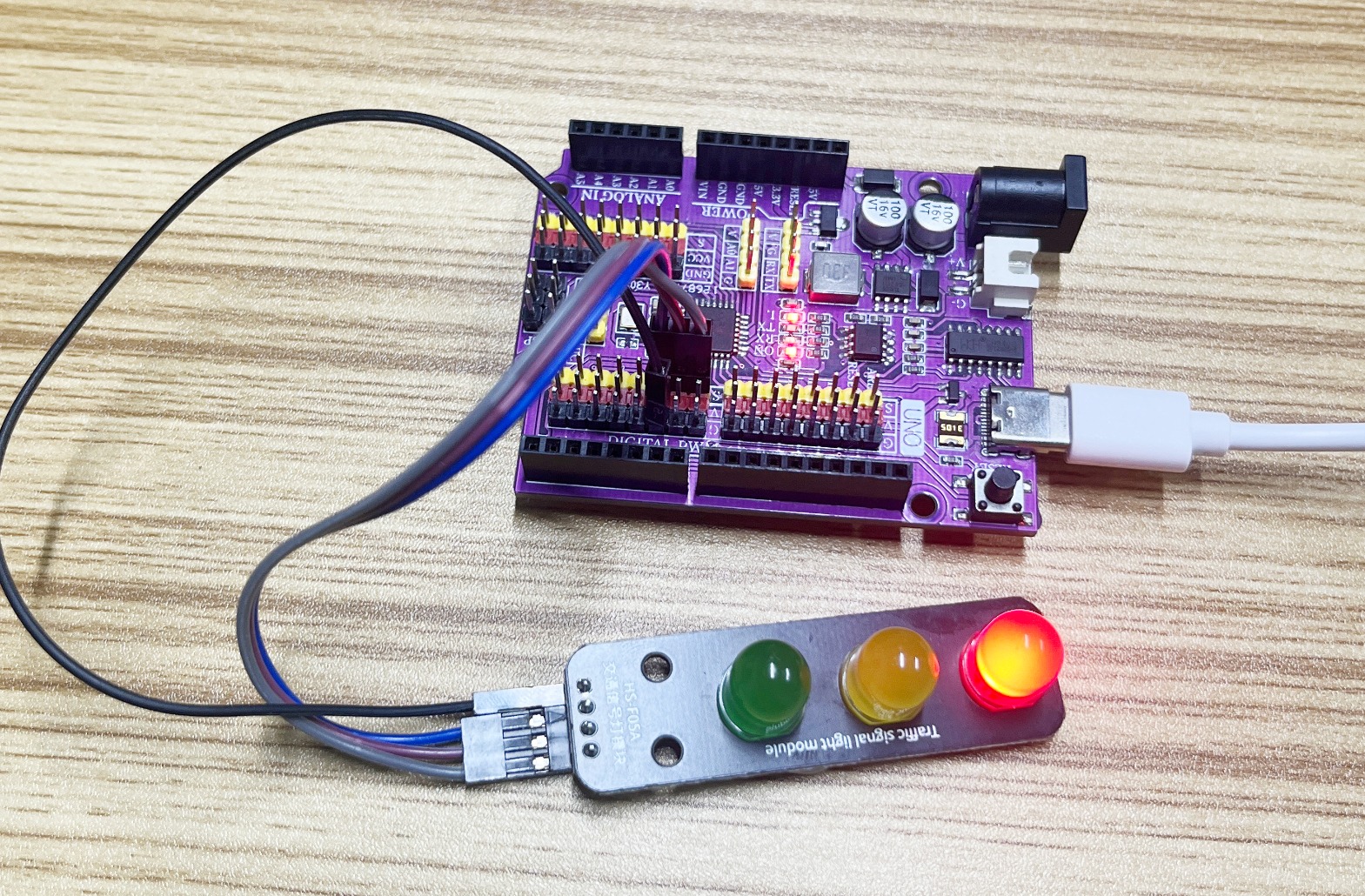After the device is connected and the above program is burned to the Arduino UNO development board, the red, green, and yellow lights will alternate on and off, achieving the effect of a traffic light.