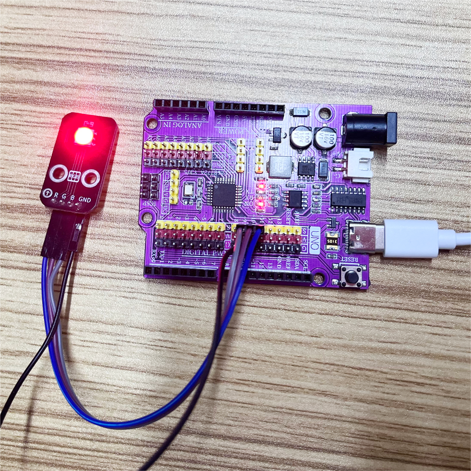 After the device is connected to the wires, burn the above program to the Arduino UNO development board, and then proceed with the color ratio according to the above ratio chart.We can see the RGB LED light change colors every second (red, green, blue).