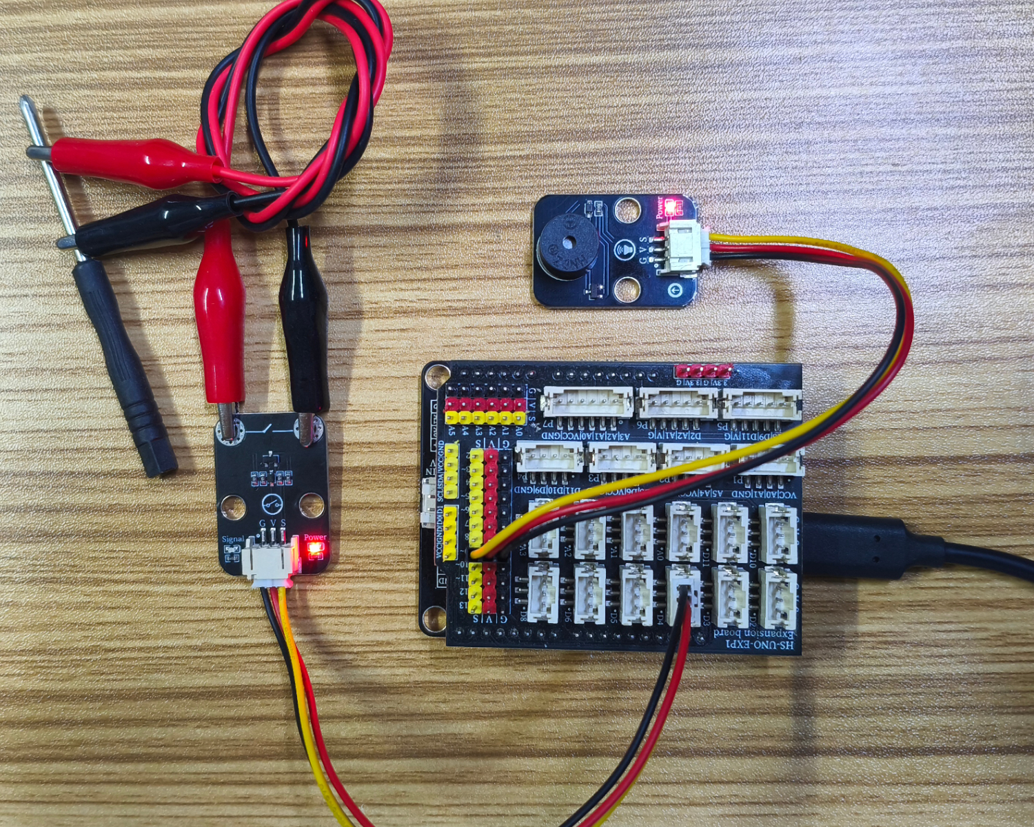 器件连接好线之后,将上述程序烧录到开发板之后,当被测物体导电时,蜂鸣器响起。