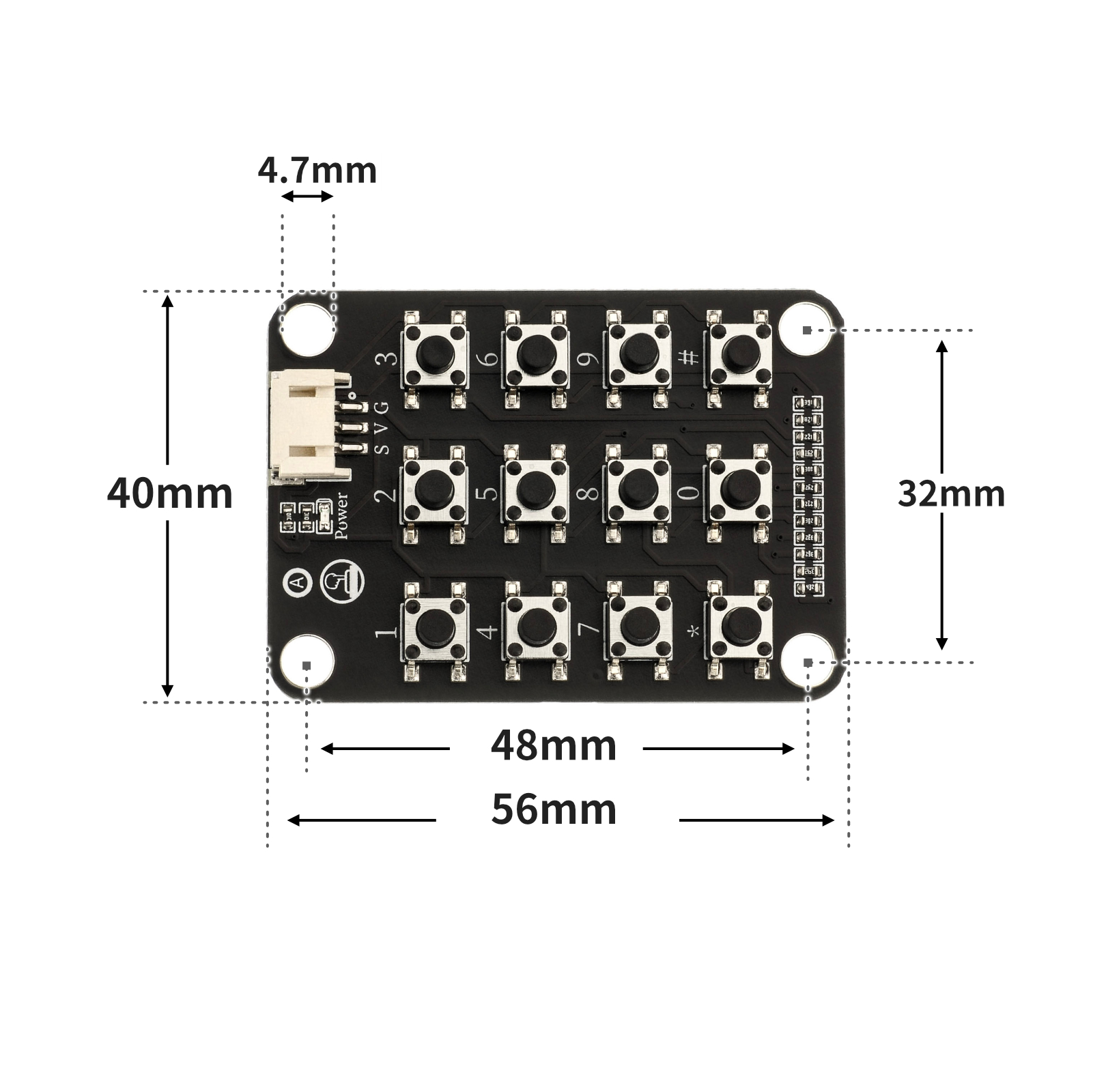 12键矩阵键盘含12个四脚按键,依靠金属弹片来保护受力情况,每个按键的四个引脚排列成矩阵的形式。在12键矩阵键盘模块中,当某个按钮被按压时,电路导通;当撤销这种压力的时候,电路断开。这个施压的力,就是用我们的手去开按钮、关按钮的动作。12键矩阵键盘共用一个模拟输出,当不同按键被按下时所输出的模拟值不同,由此可以判断是哪个按钮被按下。我们可以用一个Arduino的模拟口就可以控制12键矩阵键盘模块,可以大大减少需要使用IO接口。对于 Arduino初学者来说创作更便捷。