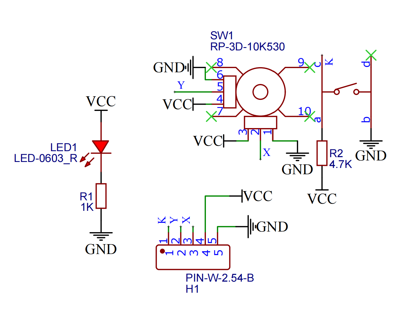 双轴按键摇杆主要由两个10K的电位器和一个按键开关组成,两个电位器随着摇杆扭转角度分别输出X、Y轴上对应的电压值,在Z轴方向上按下摇杆可触发轻触按键。在配套机械结构的作用下,无外力扭动的摇杆初始状态下,两个电位器都处在量程的中间位置。