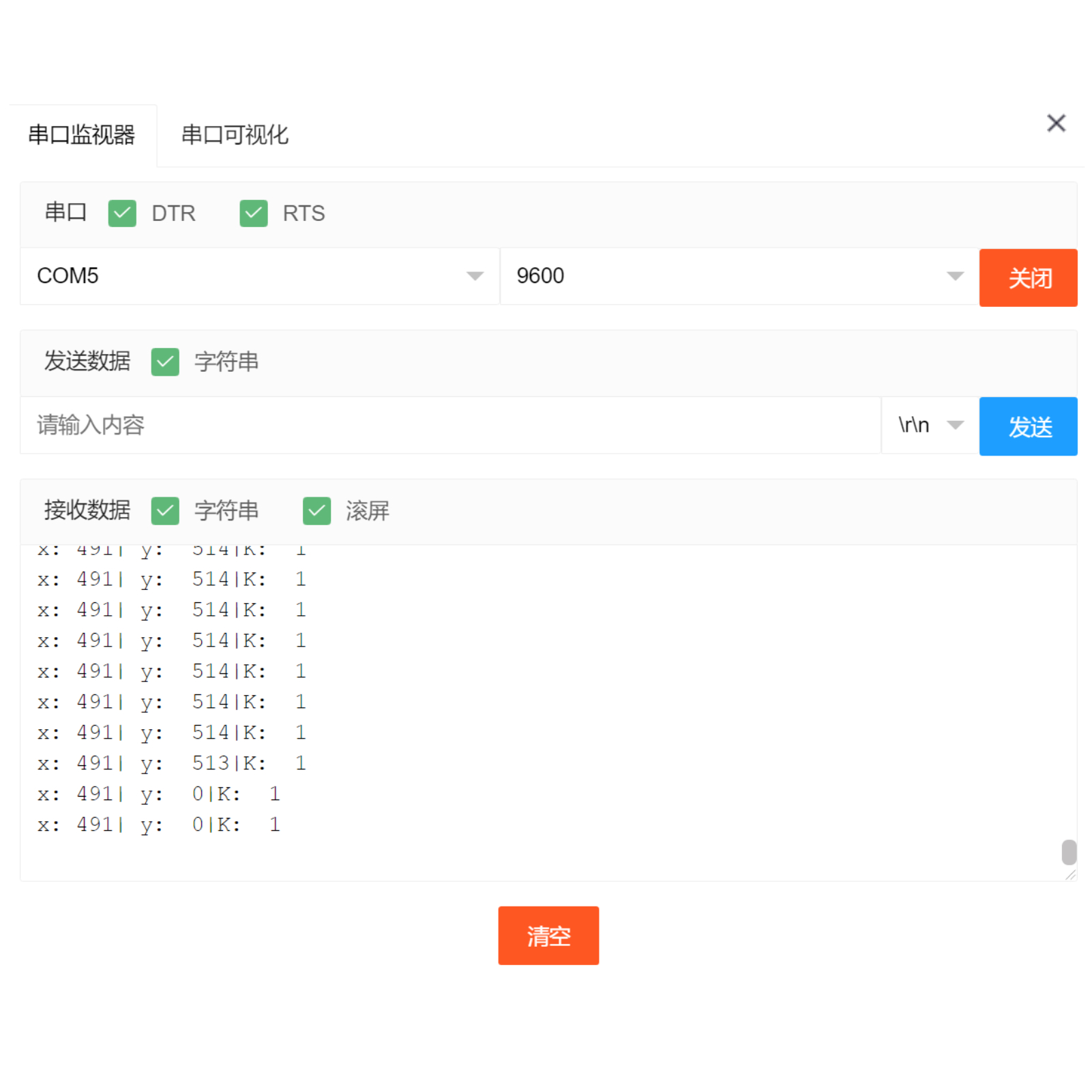 通过获取上下,左右两个端口的模拟值(0,512,1023)不同组合得到摇杆的方向,输出对应的动作,通过按键的高低电平,获取是否被按下。从串口打印可以看到上下左右的效果,达到目的。