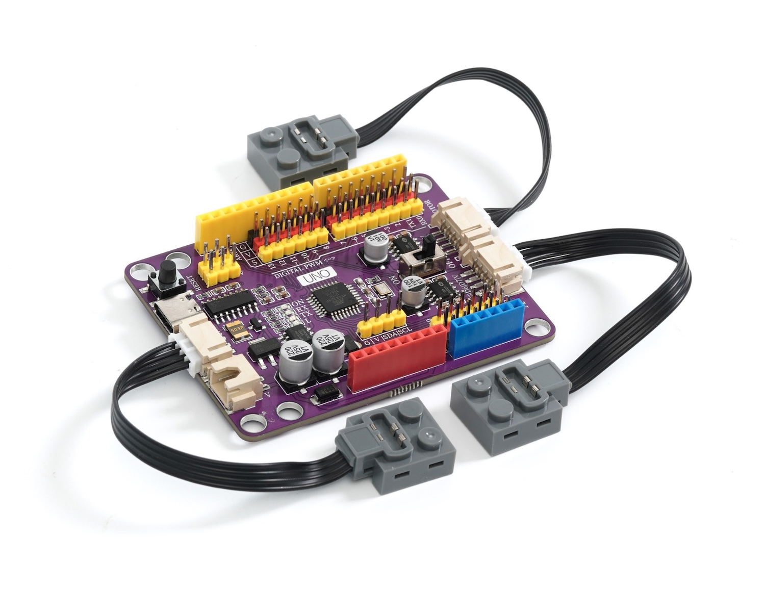 이는 레고 프로그래밍 블록과 호환되는 아두이노 개발판입니다. 이는 레고 테크 블록과 MOC 블록에 설치할 수 있습니다.