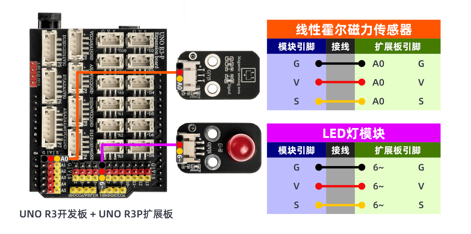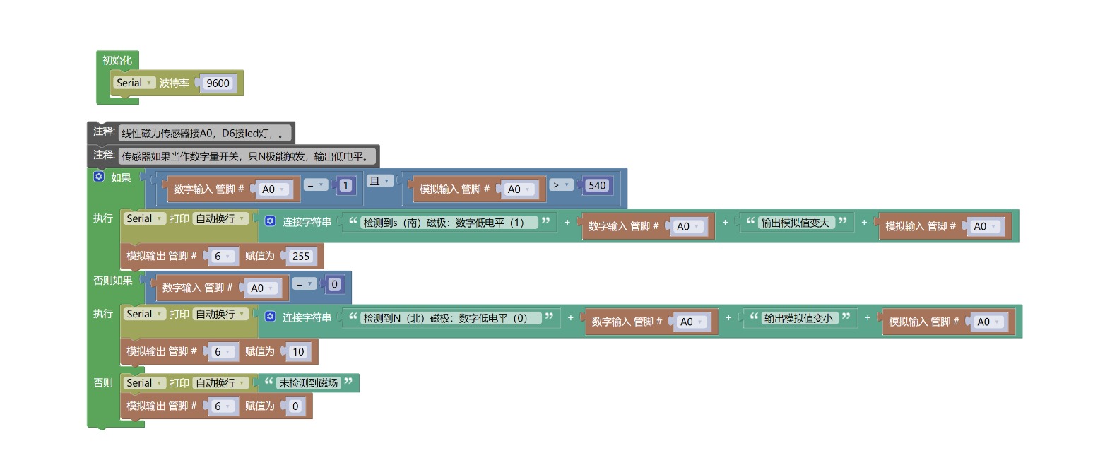 //线性磁力传感器接A0,D6接led灯,。