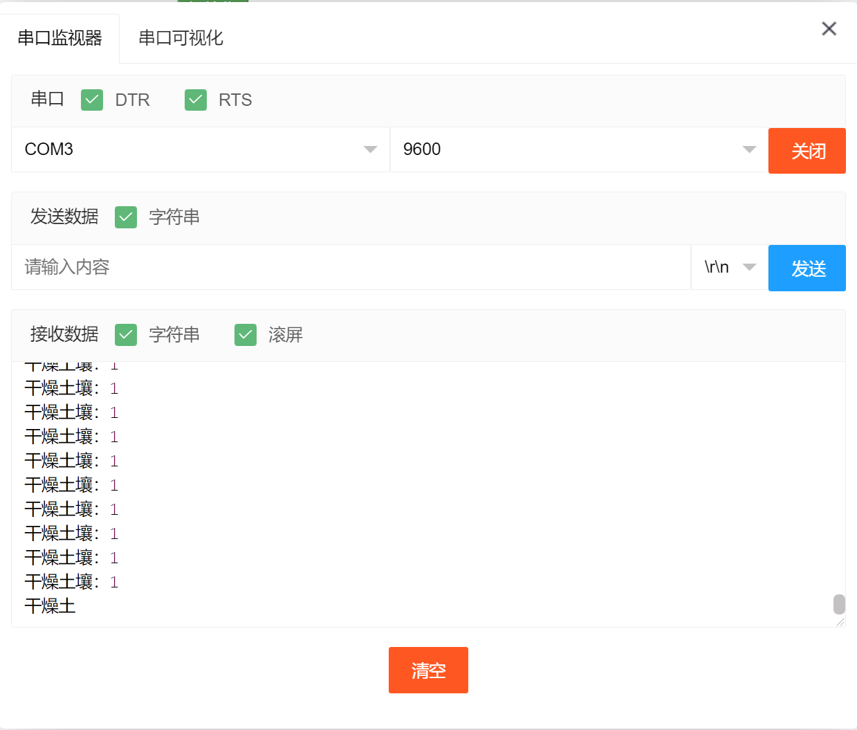 선을 연결한 장치를 통해 위의 프로그램을 Arduino UNO 개발 보드에 업로드한 후, Mxily 시리얼 모니터를 열고, 토양 습도 센서 모듈의 두 개의銅 막대기를 토양이나 물에 삽입하여, 시리얼 출력에 해당하는 글자를 출력하십시오。