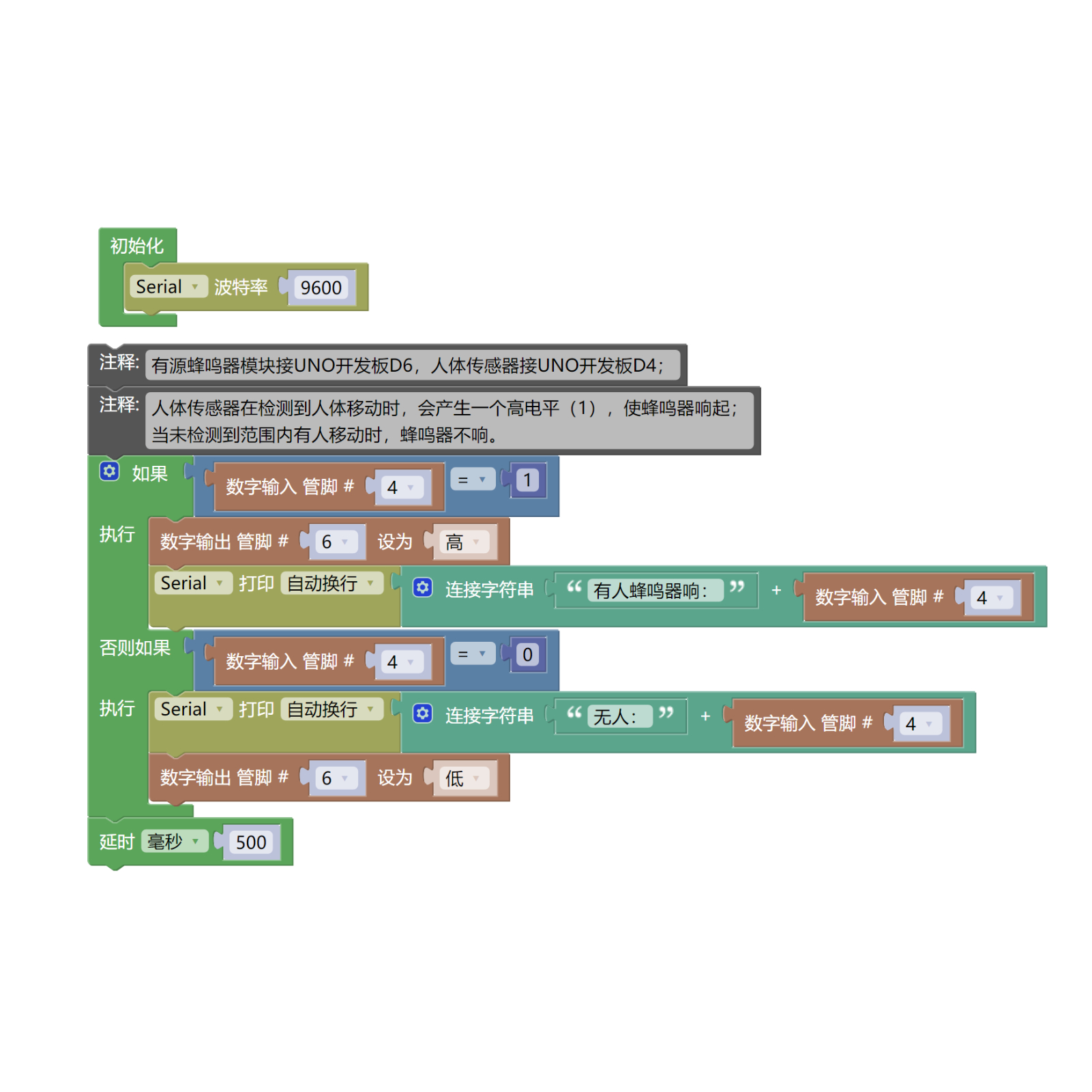 Serial.println(String("有人蜂鸣器响:") + String(digitalRead(4)));//串口打印状态值