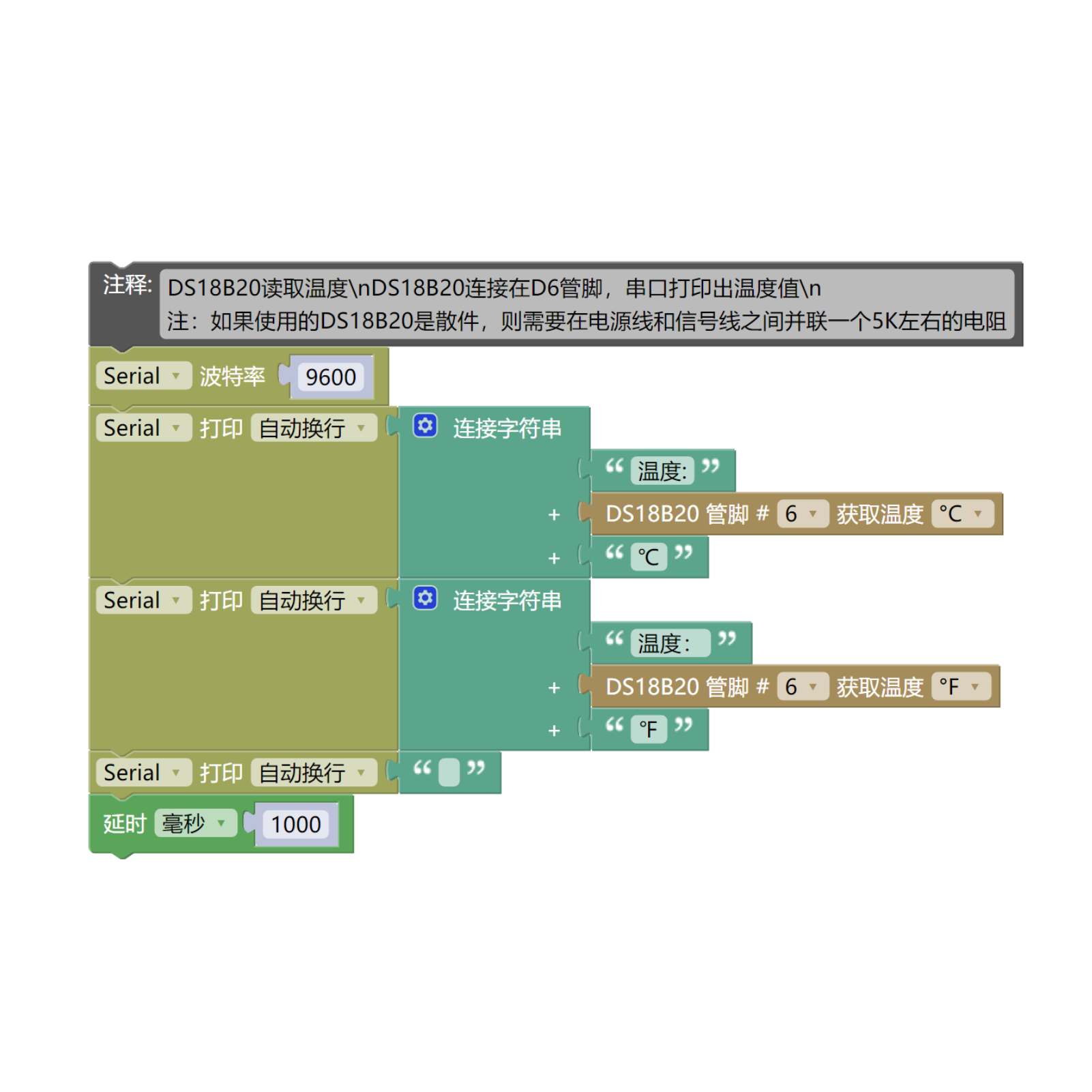 Serial.println(String("温度:") + String(ds18b20_6_getTemp(0)) + String("℃"));//以摄氏度为单位打印温度