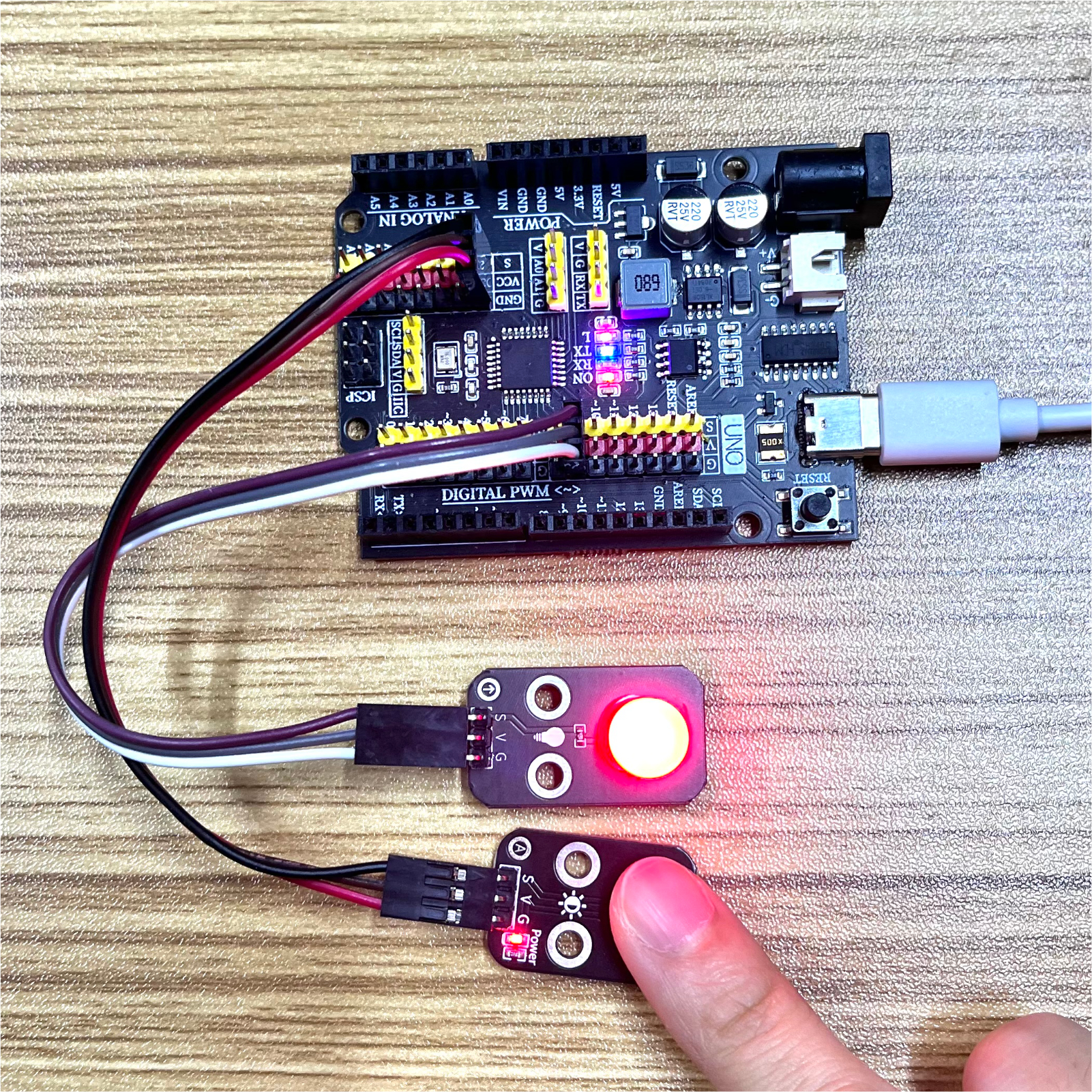 //当手遮住光敏传感器时,显示数值将变小,led灯变亮;当光线变强时,显示数值将变大,led灯变暗;