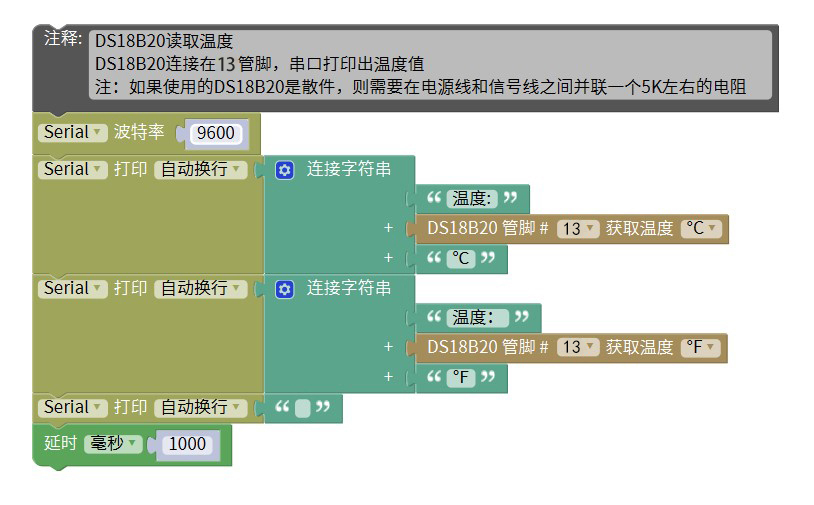 //DS18B20读取温度\nDS18B20连接在D6管脚,串口打印出温度值\n注:如果使用的DS18B20是散件,则需要在电源线和信号线之间并联一个5K左右的电阻