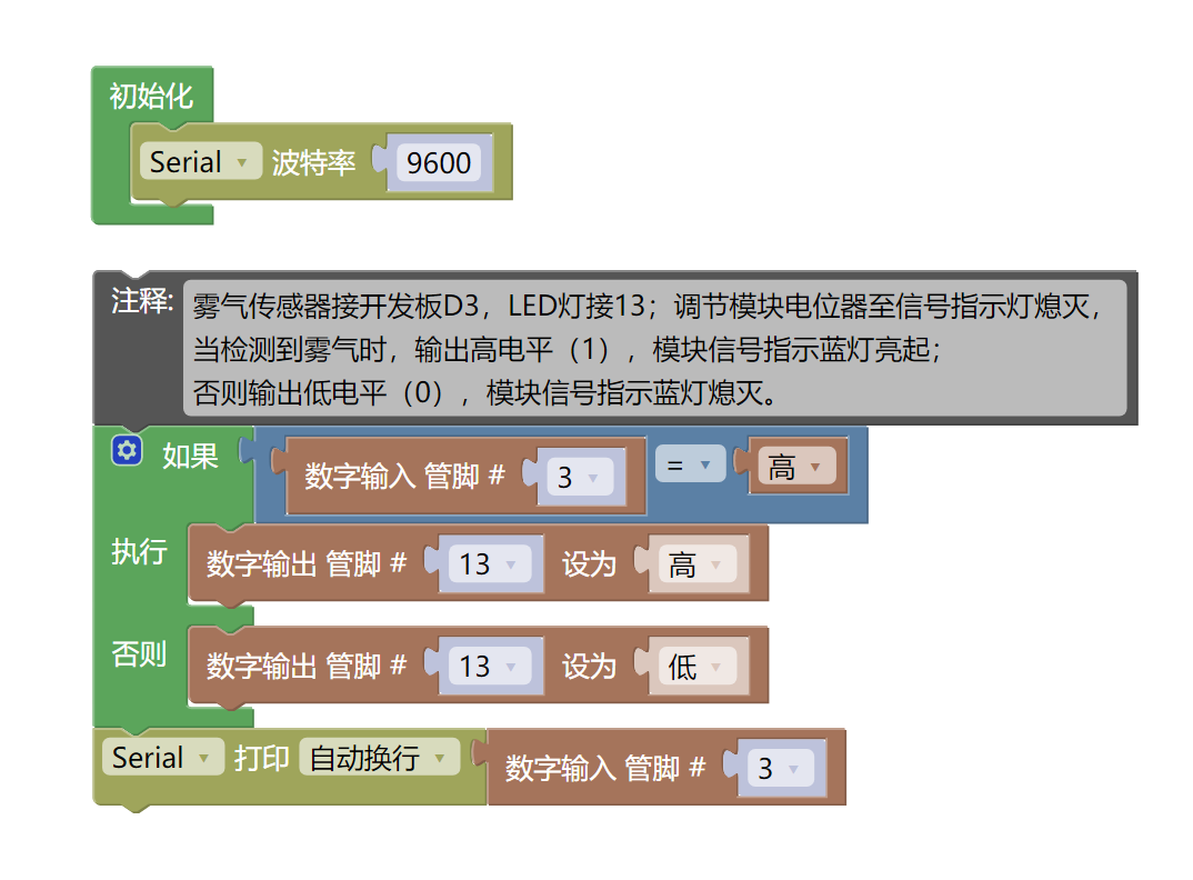 //当检测到雾气时,输出高电平(1),模块信号指示蓝灯亮起;